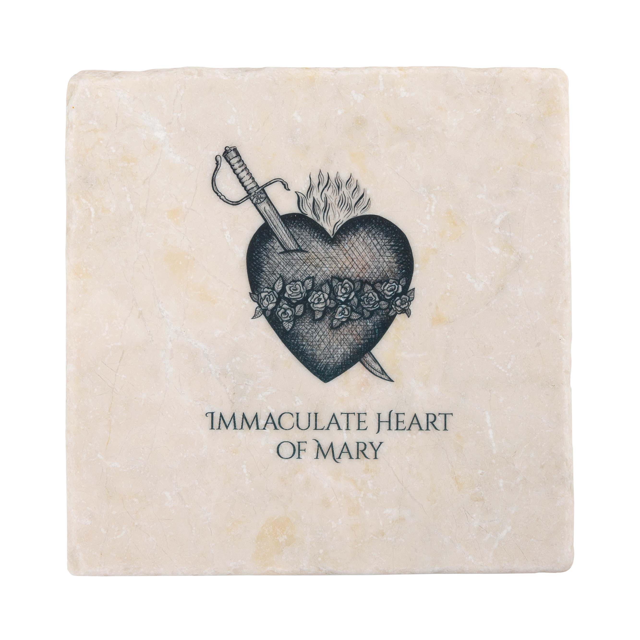Foster your devotion to the Immaculate Heart of Mary with the help of this exclusive tumbled stone tile. Designed in-house in North Carolina, this tile features a unique drawing of the Immaculate Heart of Mary. Our Blessed Mother's Immaculate Heart is the wellspring of her purity, and this tile will remind you of Mary's constant intercession and love for us.