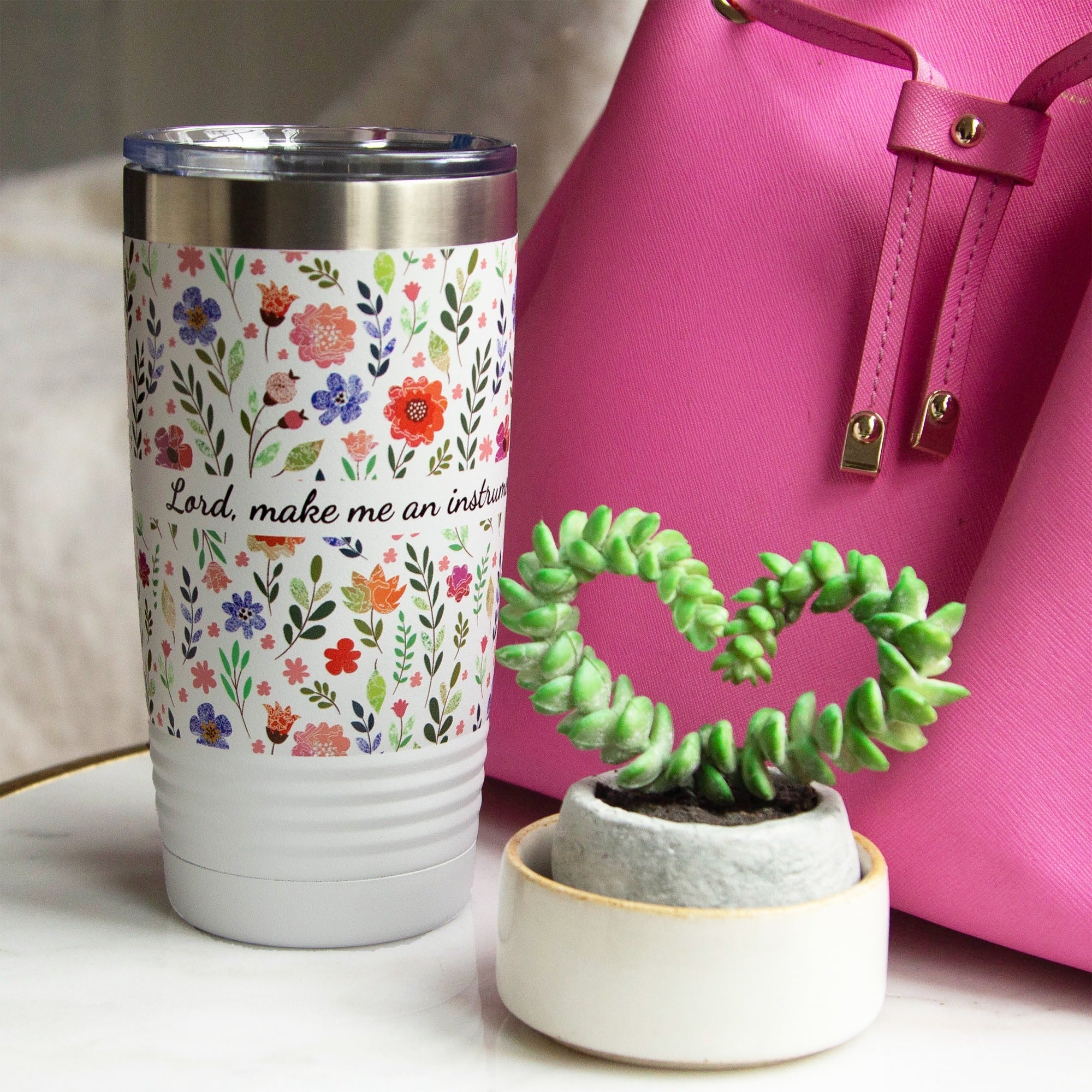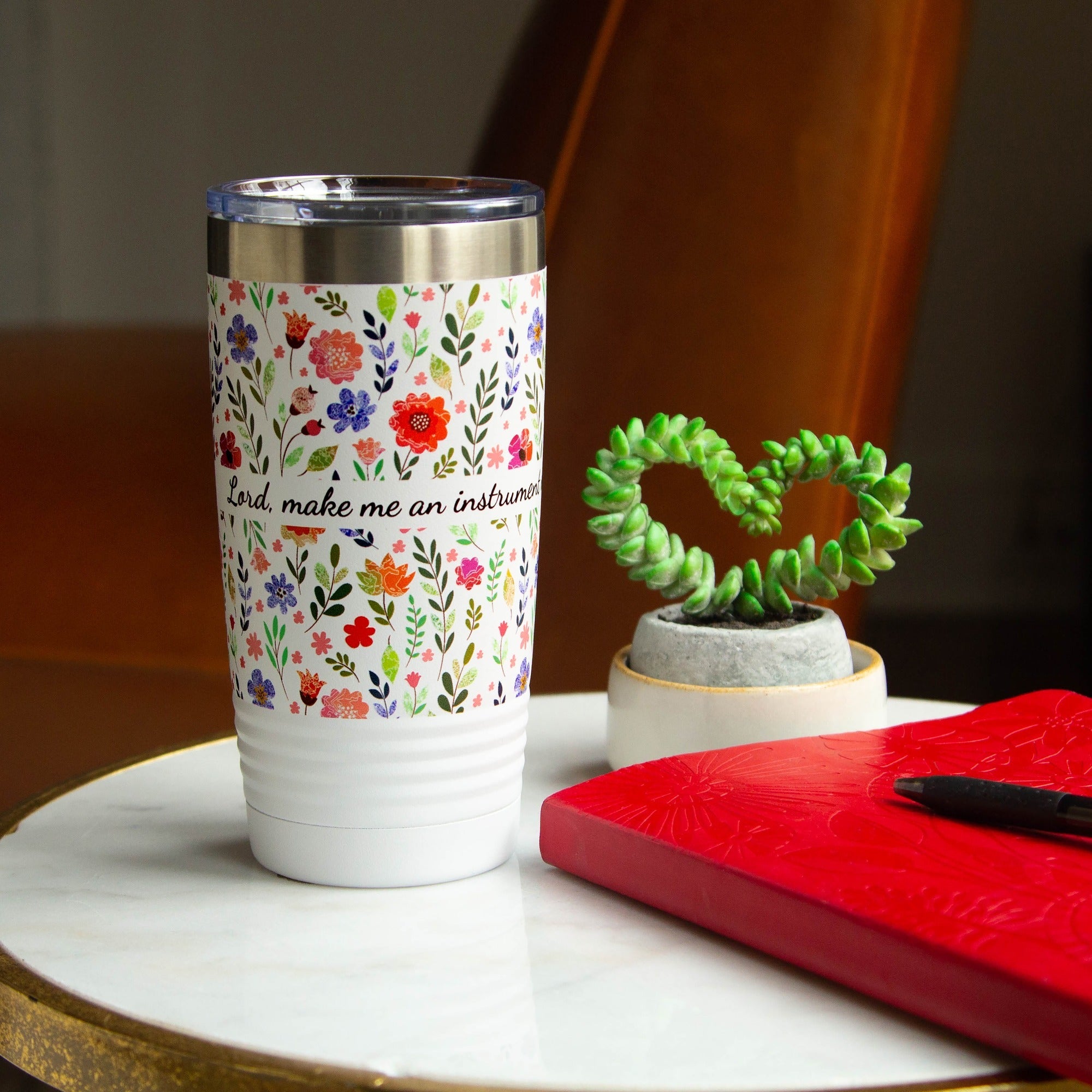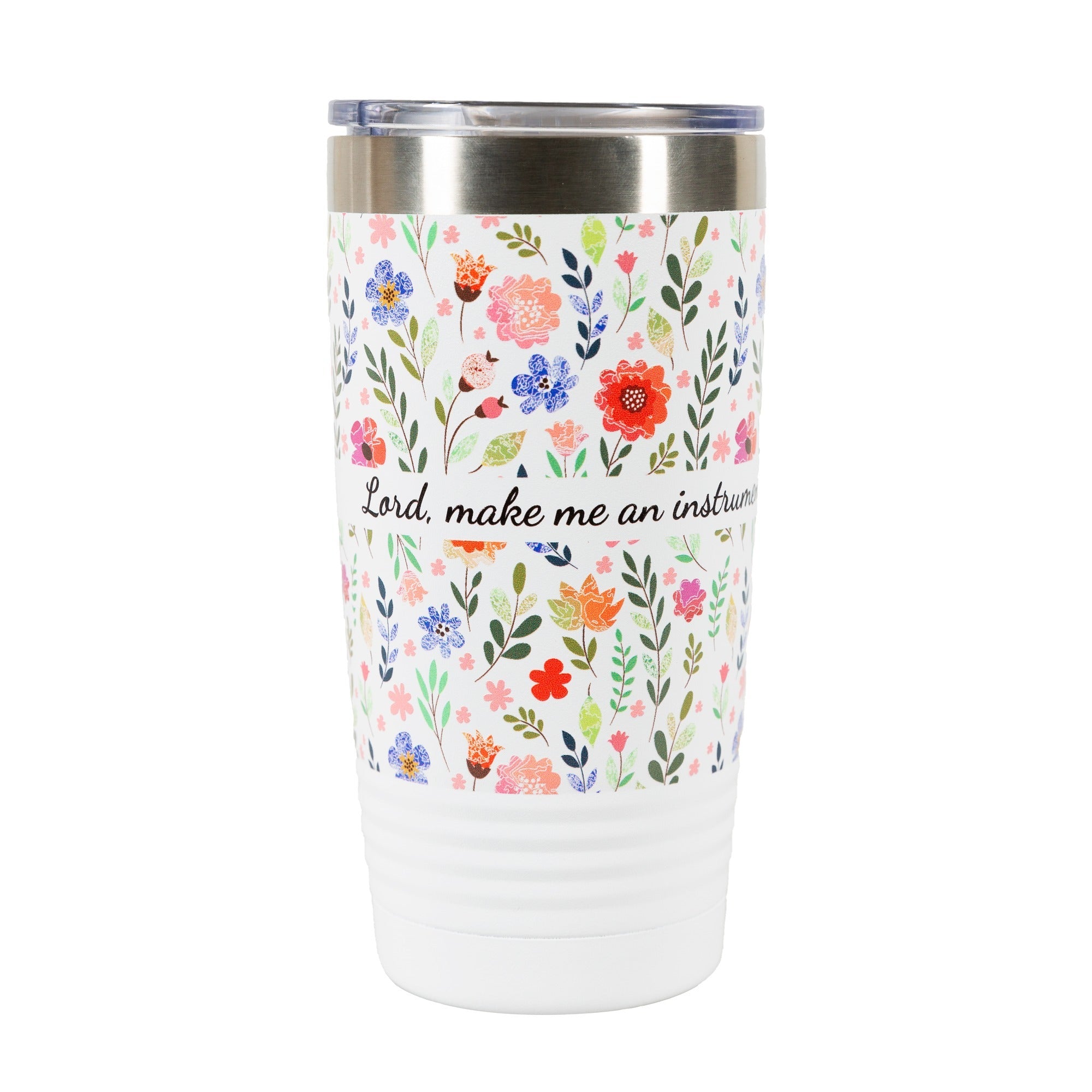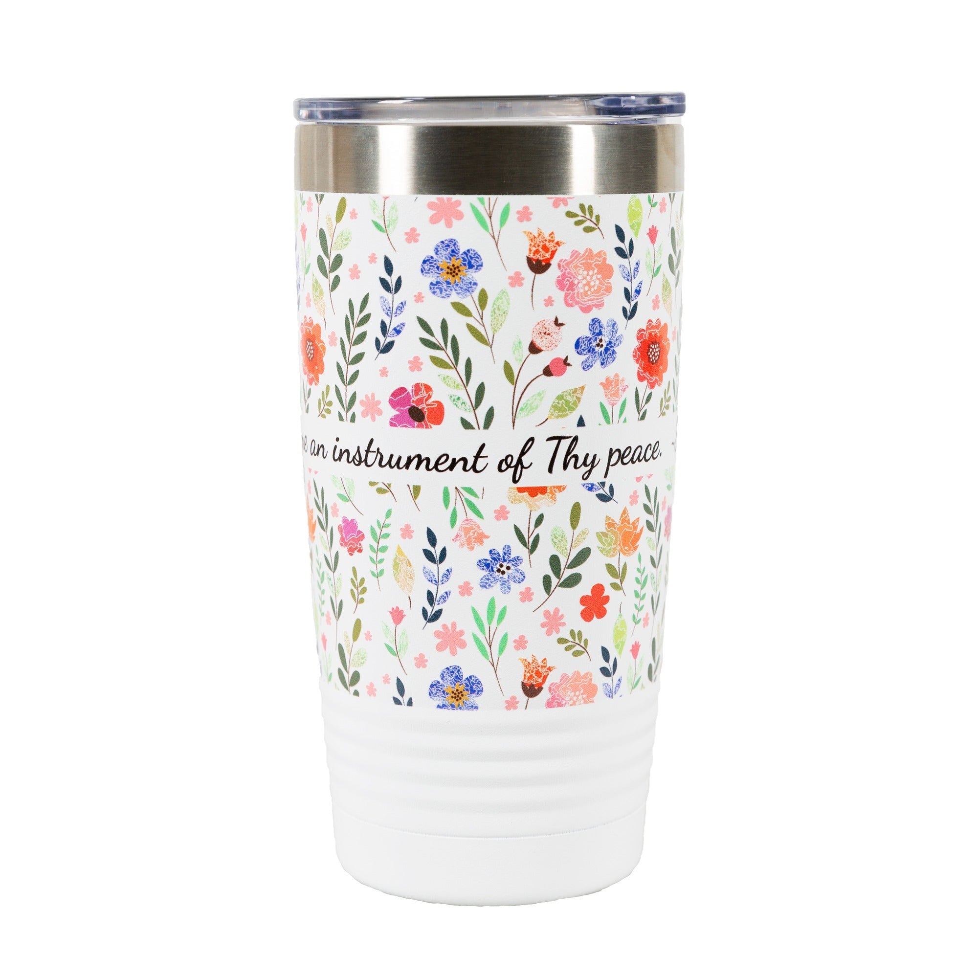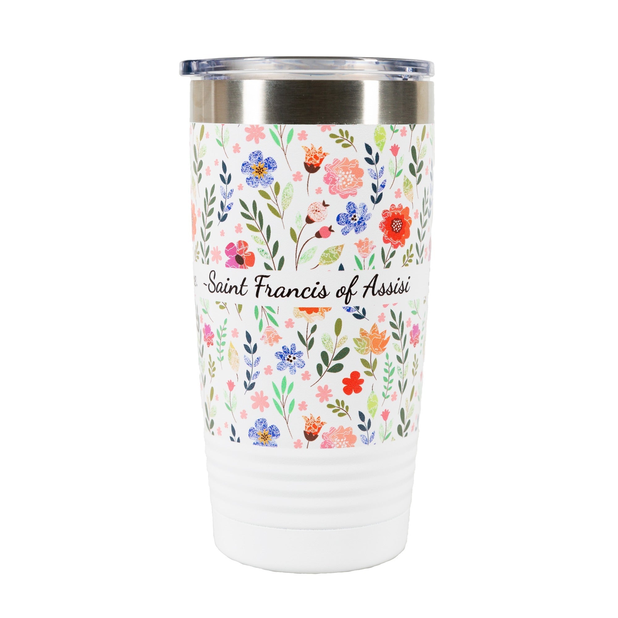 Take your prayer life on the go with this fantastic white tumbler which features the prayer “Lord, make me an instrument of thy peace,” a prayer commonly associated with the simple, trusting spirituality of St. Francis of Assisi. The accompanying floral design provides a calming effect while calling to mind Francis’ love of nature, making this a lovely product for anyone who strives to imitate him. The double-wall insulation keeps any beverage hot or cold for hours, making this a delightful gift for any occasion.