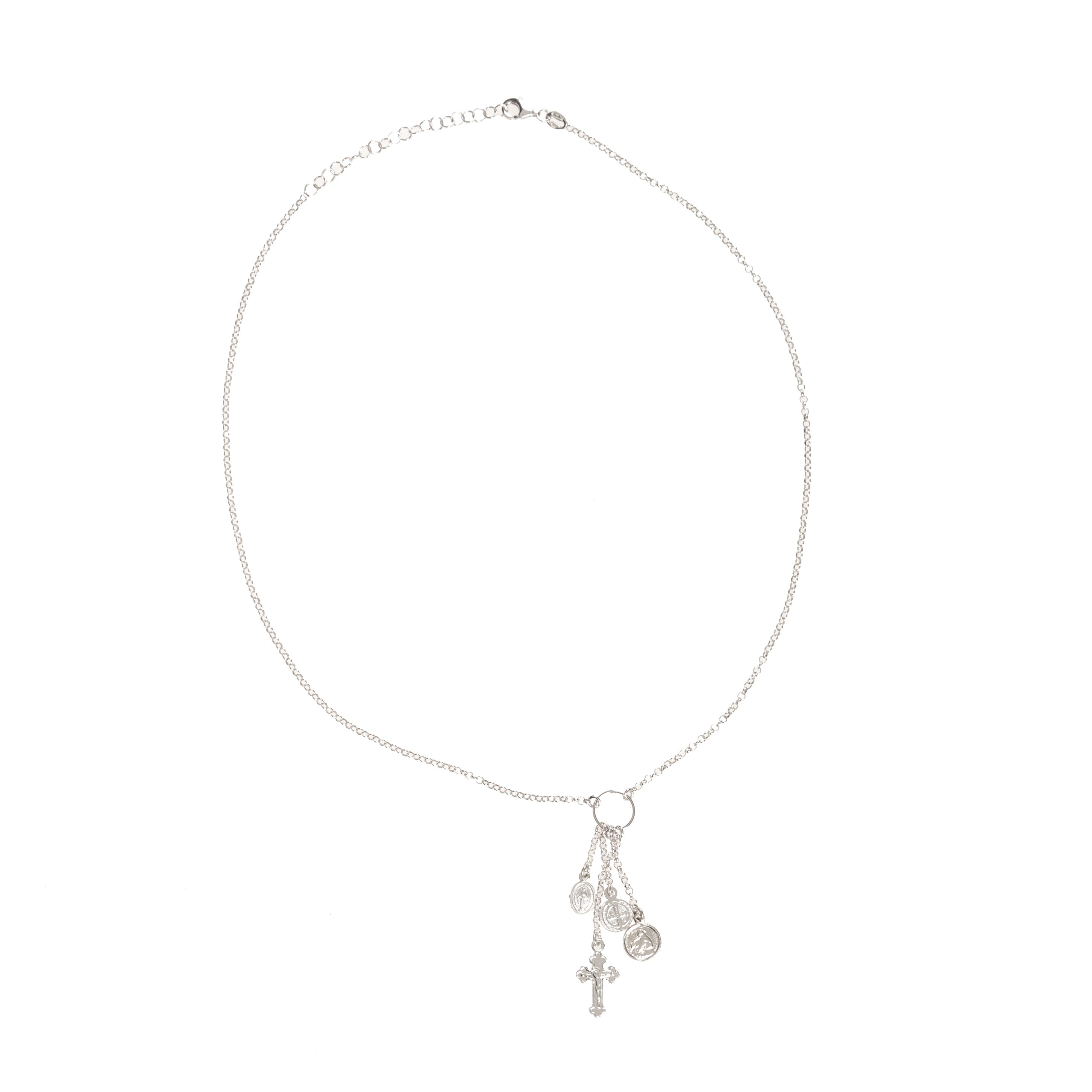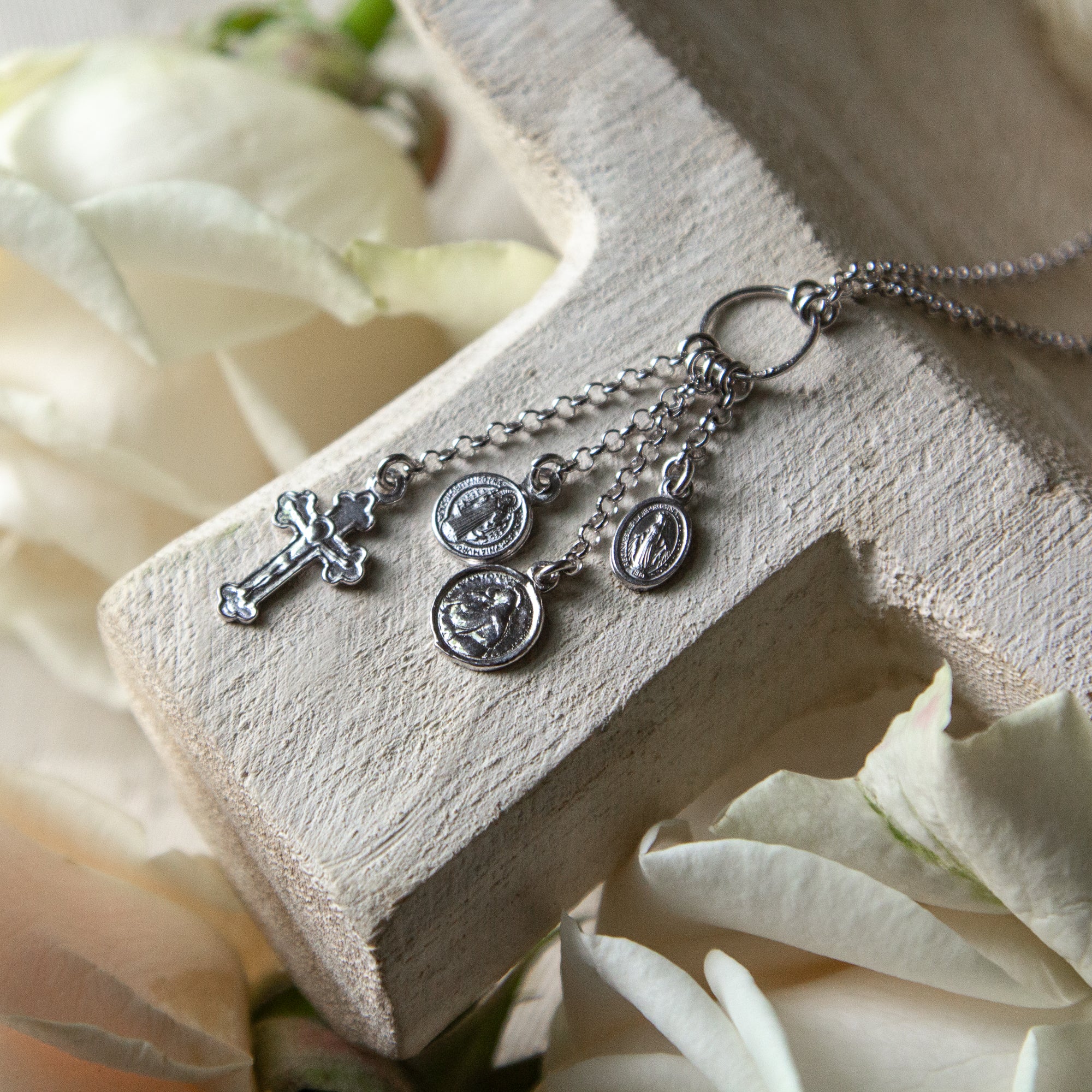 This Italian Sterling Silver Holy Medals Necklace features a petite cluster of holy medals, including St. Benedict, St. Anthony, the Miraculous Medal, and an ornate crucifix, all dangling from a delicate chain for a unique and devotional piece. Crafted in Italy, it serves as a beautiful expression of faith and a lovely addition to any collection. Chain length: 16" + 2" extender.