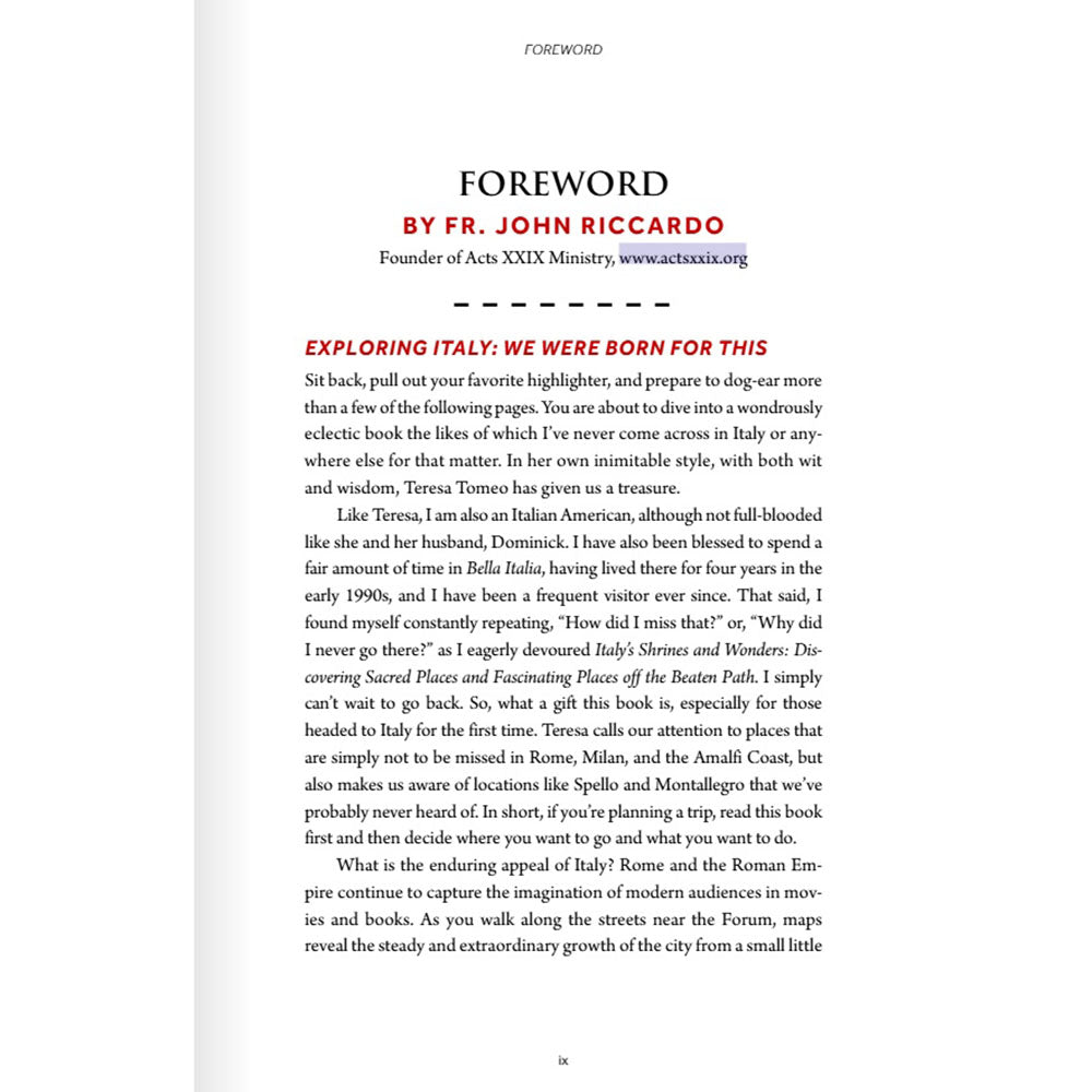 Discover Italy’s rich spiritual heritage and breathtaking beauty with Teresa Tomeo, bestselling author and Catholic media personality, as your guide. Drawing from over sixty trips and her experience as a part-time resident of Italy, Tomeo offers an insider’s perspective on the best sites, hidden gems, and cultural treasures across this storied land of saints.