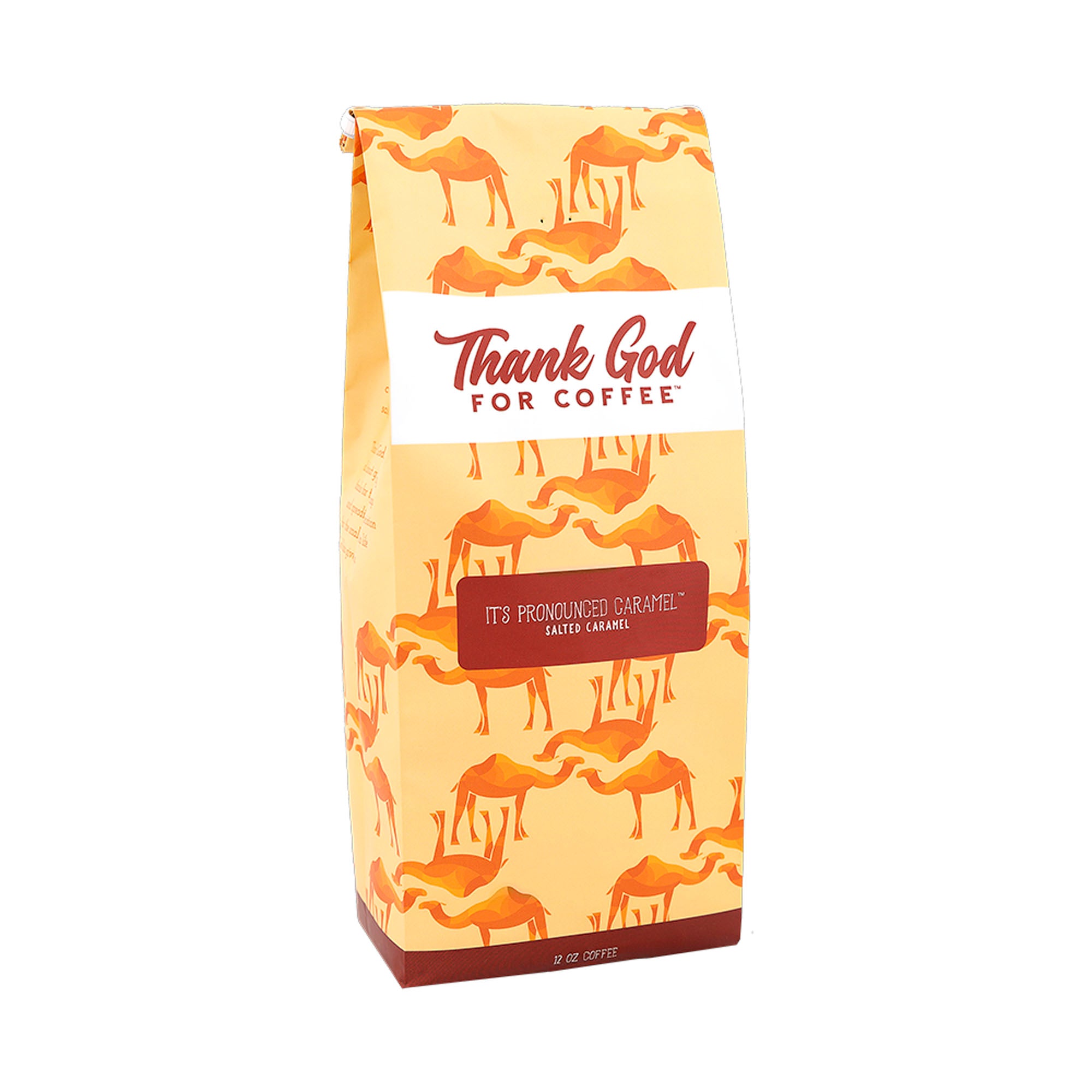Experience the delightful blend of "It's Pronounced Caramel Coffee" in a 12oz bag, whether ground or whole bean. With a medium roast and enticing light chocolatey notes, the rich caramel finish offers the perfect brew for any occasion. Part of the exclusive Thank God For Coffee Collection, this single-origin Honduran coffee is an enviable gift for any coffee lover.