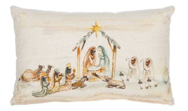 A lovely accent pillow for Christmas time, featuring an ivory cotton cover decorated with serenely colored images of the Nativity Scene. The neutral tones and watercolor style imagery will coordinate with any look, and the lumbar sizing means it is not only decorative but functional and comfortable for chairs, couches, or beds at home. Add a touch of the season to any space with this pretty pillow that reminds us of the true gift of Christmas.