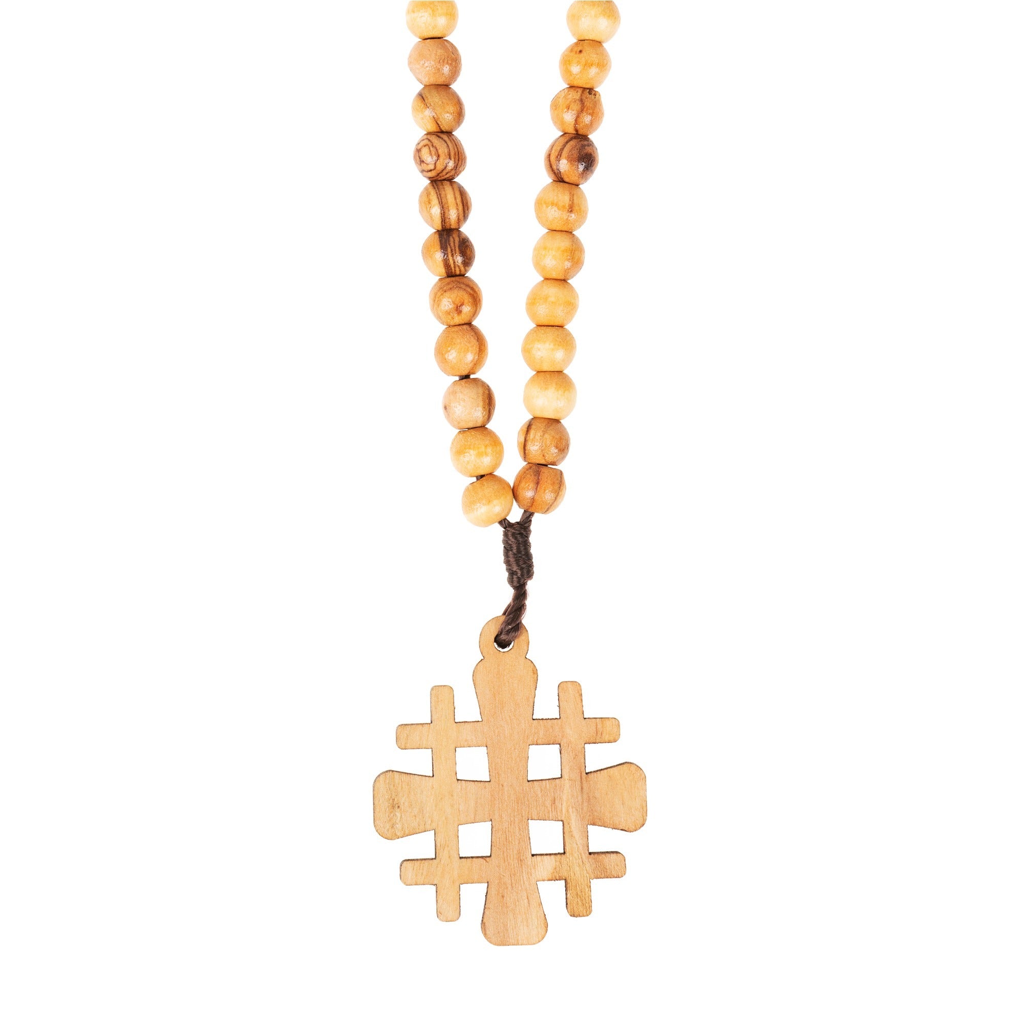 A strand of 100 wooden beads with a finely detailed Jerusalem Cross, honoring the name of Jesus and imploring the mercy of God. Tuck them into the stamped ivory pouch (included) for storage and protection. The beads from this ancient devotional of the Orthodox & Eastern Churches are handcrafted using the pruned branches of the olive trees growing on the hills of Bethlehem and Jerusalem.