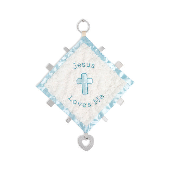 The Jesus Loves Me Activity Blanket is a soft, snuggly lovie that comforts babies with cozy fabric, satin tabs, and an attached teether. Featuring the words "Jesus Loves Me" and a Cross in the center, it provides a soothing routine for nap or playtime. Available in blue or pink, it's a perfect gift for baby showers, new births, or baptisms. Machine washable for easy care.