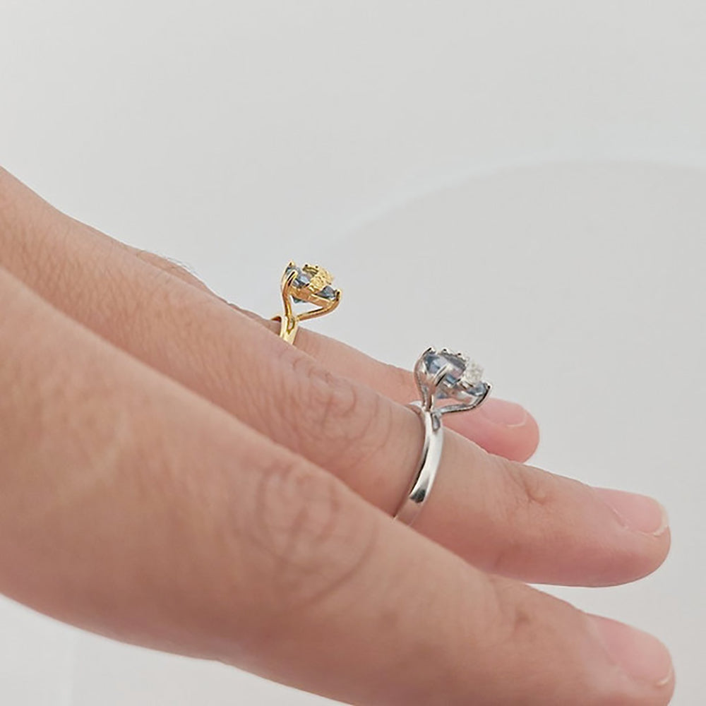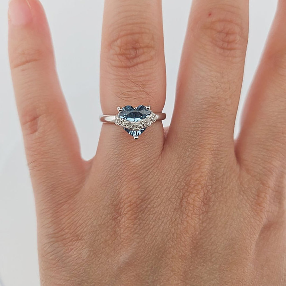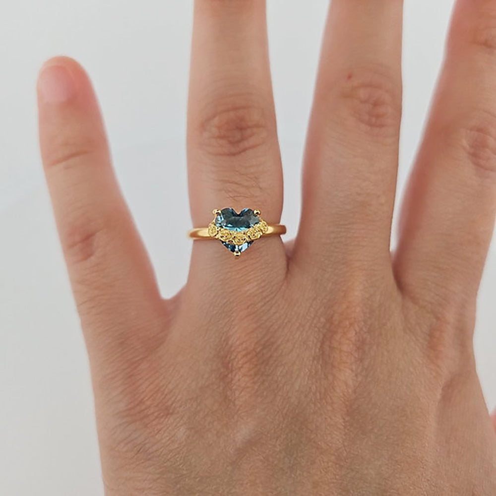 The Jeweled Immaculate Heart Ring showcases a stunning heart-shaped blue CZ gemstone, elegantly encased in a setting adorned with petite roses. Available in adjustable sizes, the ring comes in either 18 KT Gold or Rhodium-plated Silver. This exquisite and feminine piece serves as a meaningful gift for her, honoring Our Lady or celebrating special occasions.