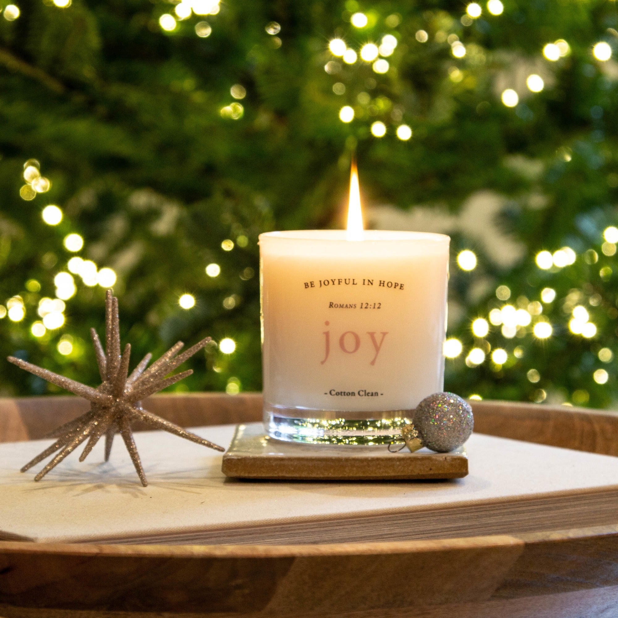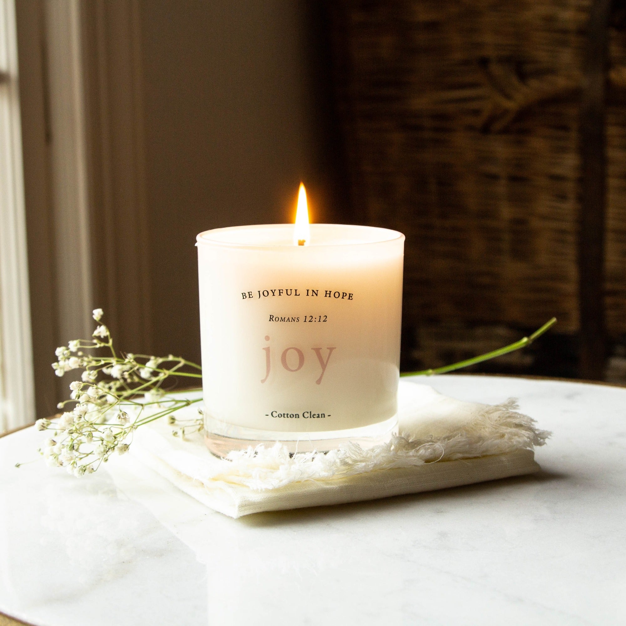 Bring Christian decor and peace into your home with this serene candle. The refreshing Cotton Clean scent provides peaceful ambience, and the uplifting theme of "Joy" on this candle ensures that you maintain the joy that is a true sign of God's grace in our lives. If you love when home decor also serves as a reminder of God's love for you, this candle perfectly fills that need. Makes a delightful gift for a friend.