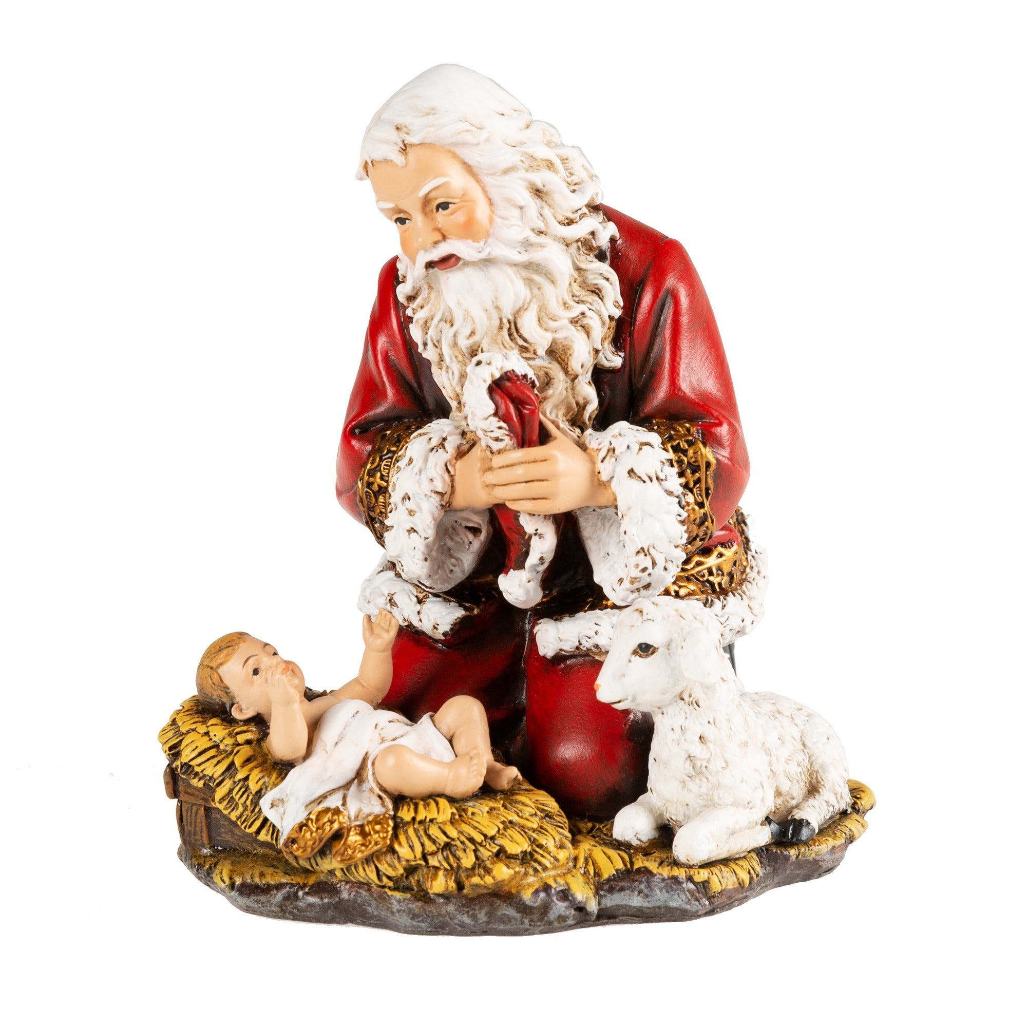 In this beautiful, full color resin statue, Santa Claus kneels in adoration of the Newborn King, hat in hand, as a beautiful, white lamb looks on. Jesus raises His arms in loving greeting or blessing. What a wonderful way to show children that even Santa recognizes that the true gift of Christmas is the Christ.