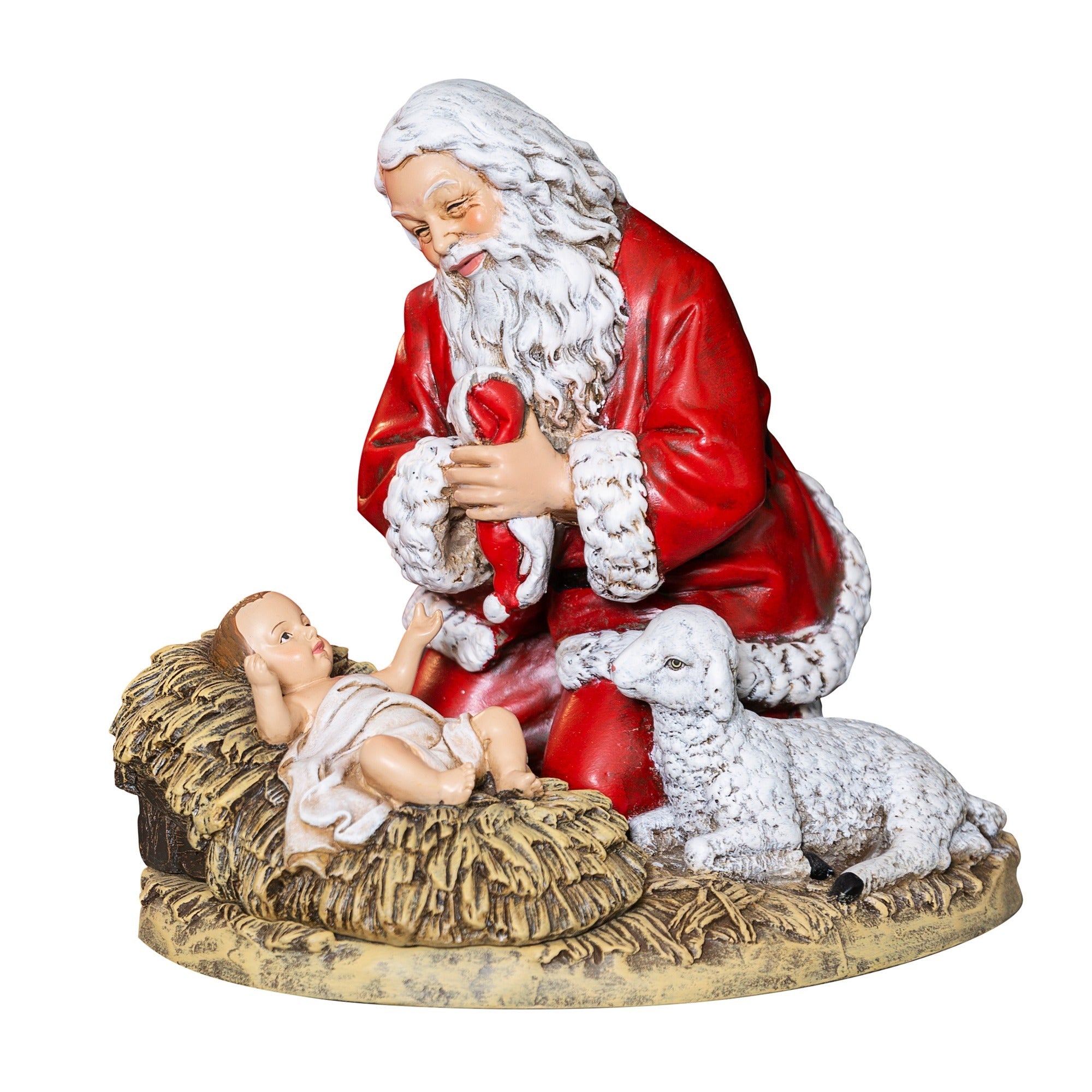 The Kneeling Santa Figure, standing 8 inches tall, beautifully merges the sacred and secular elements of Christmas. Crafted from resin-stone, this special keepsake depicts Santa reverently gazing at the Christ child. Part of the Kneeling Santa collection, it symbolizes a heartfelt moment of adoration and makes for a meaningful addition to your holiday decor.