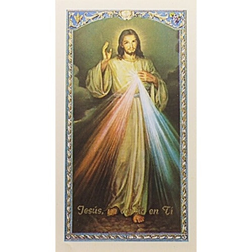 Durable and everlasting laminated holy prayer card that contains full color image of Divine Mercy Jesus on the front, and prayer written in Spanish on the back. Card measures 2 1/2 inch by 4 1/2 inch. Back of prayer card reads: El Rosario de la Divina Misericordia (The Divine Mercy Chaplet) – ( recitado en un Rosario comun de cinco decenas) Comienza Con: Padre Nuestro, Ave Maria, Credo. Luego, en las cuentas del Padre Nuestro, dirás las siguientes palabras; Padre Eterno, Te ofrezco el Cuerpo y la Sangre, el Alma y la Divinidad de Tu Amadísimo Hijo, Nuestro Senor Jesucristo, en expiación por nuestros pecados y los del mundo entero. En las cuentas del Ave María, dirás las sigulentes palabras: Por motivo de Su dolorosa Pasion, ten misericordia de nosotros y del mundo entero. Para terminar, tres veces dirás estas palabras; Santo Dios, Santo Fuerte, Santo Inmortal, ten piedad de nosotros y del mundo entero. Hecho en Italia!