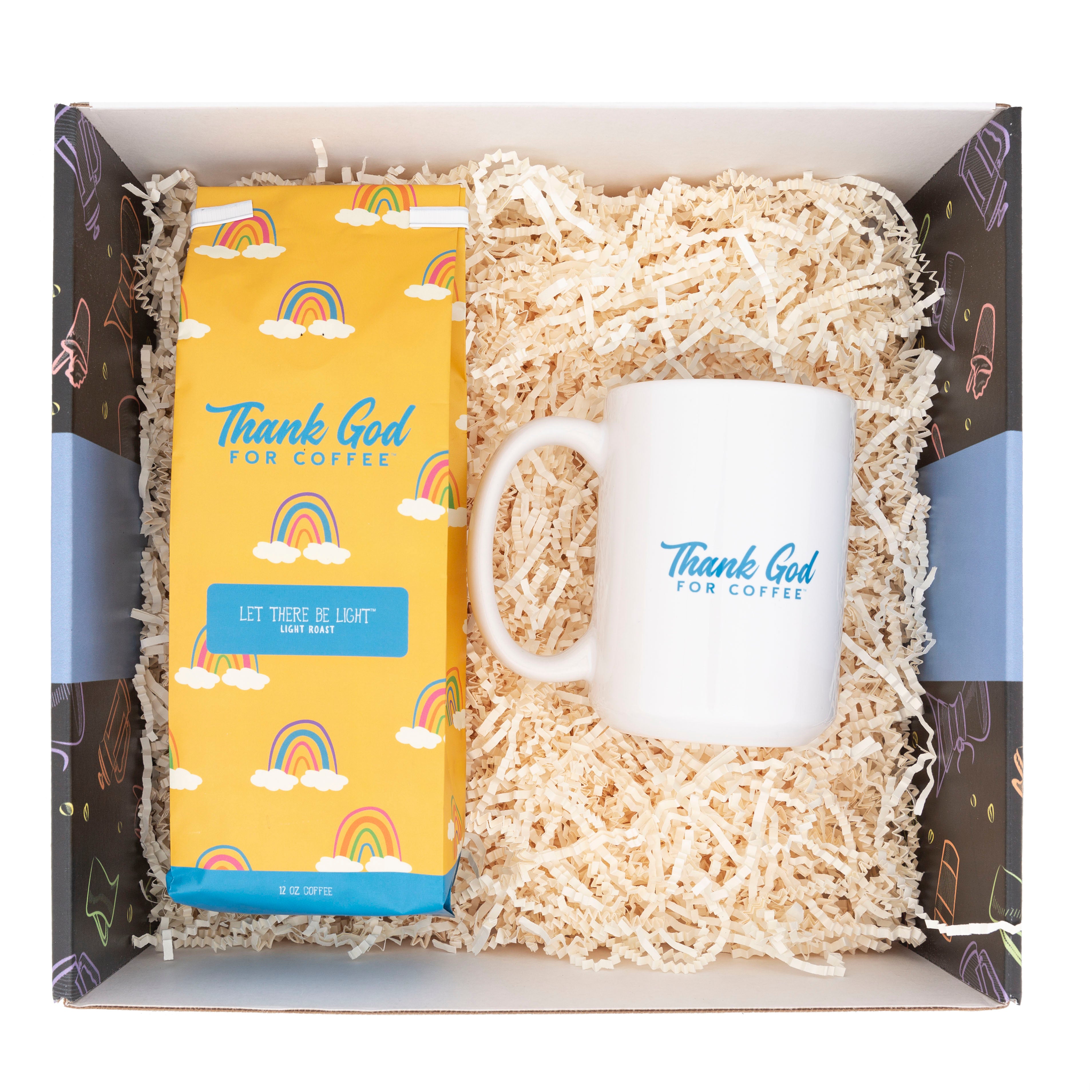 If you’re grateful for the gift from God that is coffee, why not share that gift with others? This coffee gift box features a 12oz bag of our light roast coffee, dubbed “Let There Be Light,” and a delightful Thank God For Coffee coffee mug. A fantastic way to show your appreciation for a coworker, teacher, or loved one.