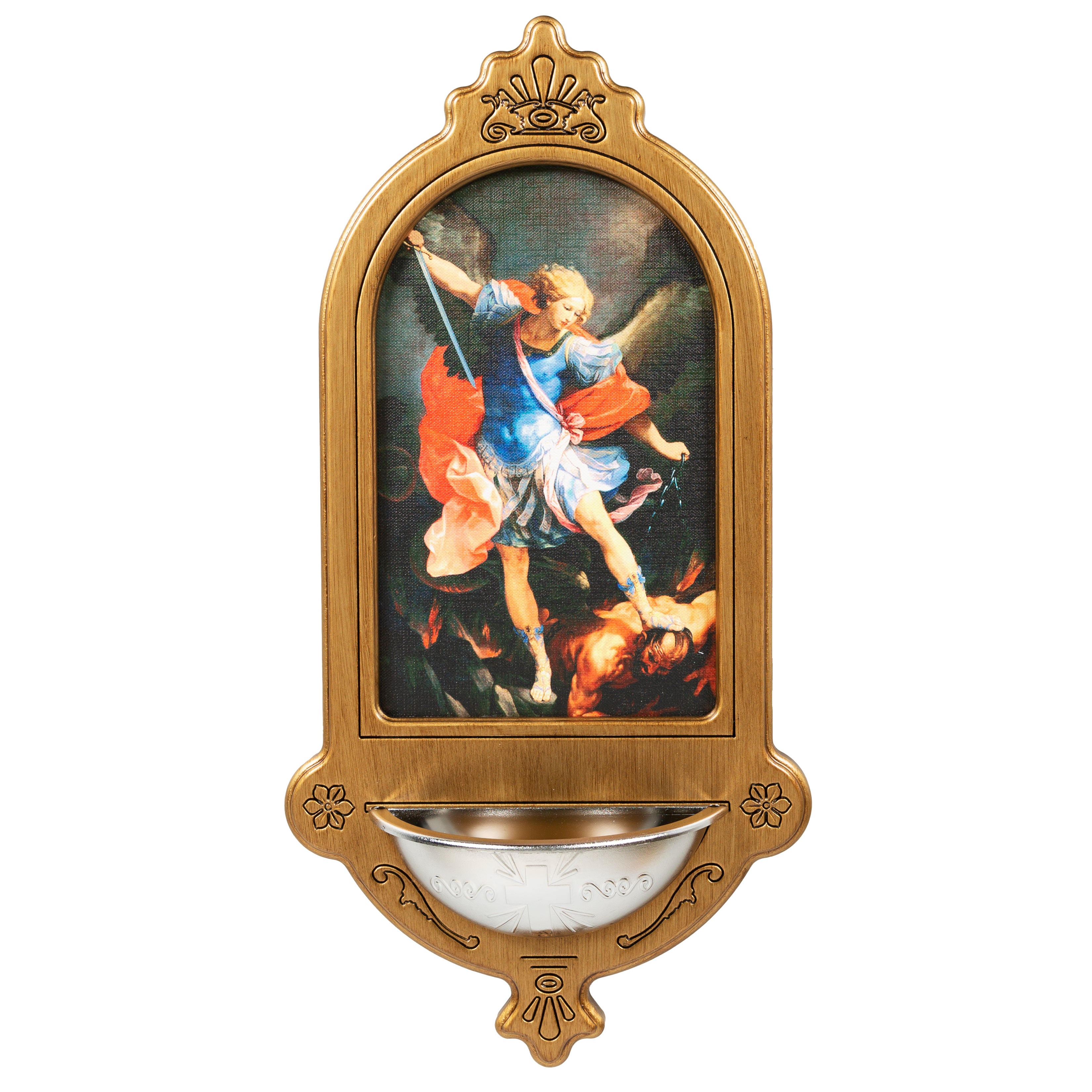 This generously sized holy water font features a light, naturally stained wood base, embellished with scalloped, swirled and floral motifs, a silver tone metal receptacle for holy water, and a full color image of St. Michael, the Prince of Angels, claiming victory for the Kingdom of God. Perfect for your sanctuary, chapel, school, or any sacred space. Made in Italy.
