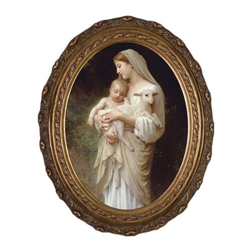 This captivating and delicate image of Our Lady and the Christ Child is known as L'Innocence by William-Adolphe Bouguereau. In it, Mary symbolically holds both the Infant Jesus and a spotless lamb. Neutral colors that are restful and serene add to the loveliness of the piece. The canvas is framed ornately, in an antique gold finsh, oval-shaped frame of fine art quality. It features elegant Florentine detailing, giving the piece a finished and distinctive look. A special expression of faith, and a precious gift for anyone devoted to the Madonna & Child.
