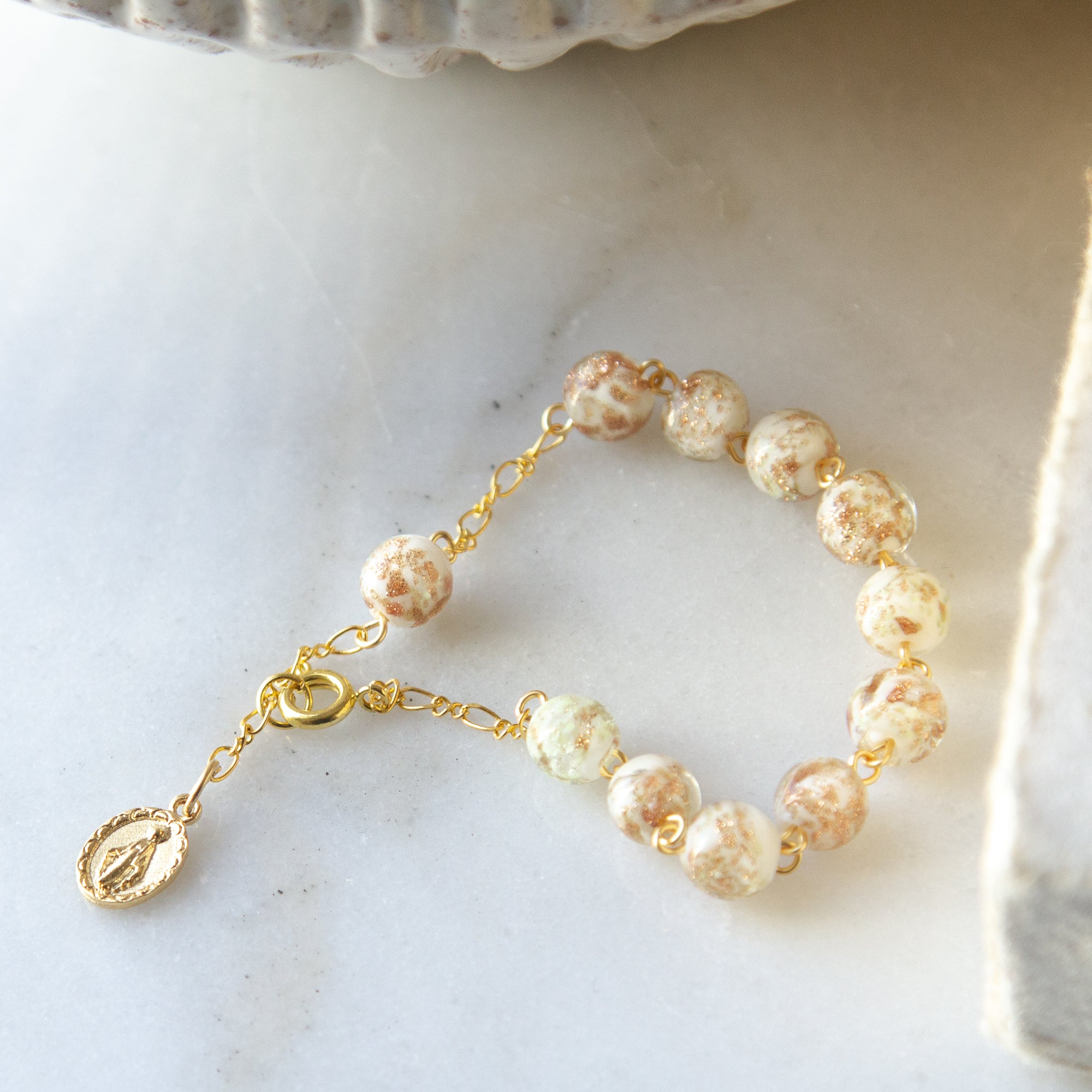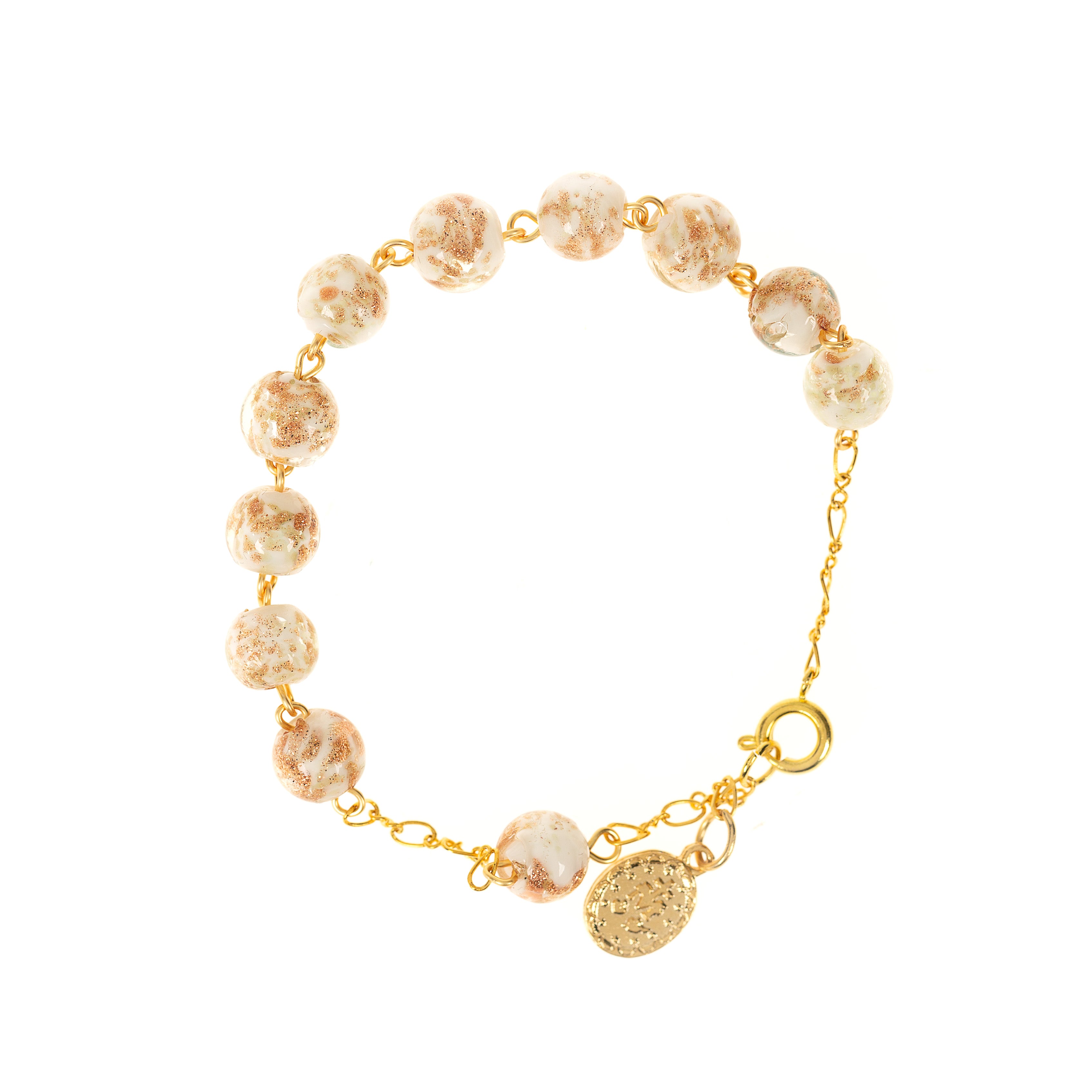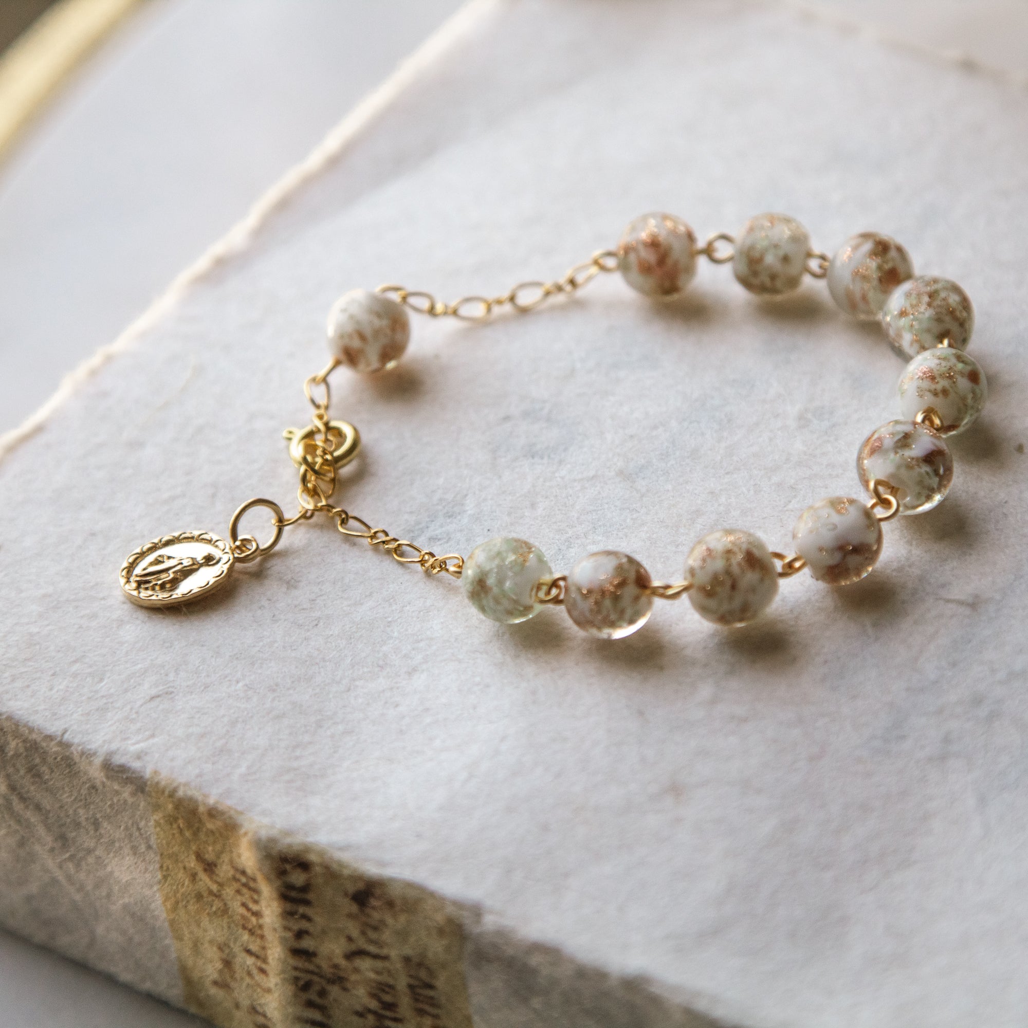 The Luminous Glass Rosary Bracelet from Fatima is a stunning piece featuring clear glass beads with gold and white flecks, perfectly complemented by a gold Our Lady of Grace medal. This 8" bracelet can be styled with any outfit, offering a blend of faith and fashion. Made in Portugal and beautifully gift-boxed, it's a cherished addition to her jewelry collection.