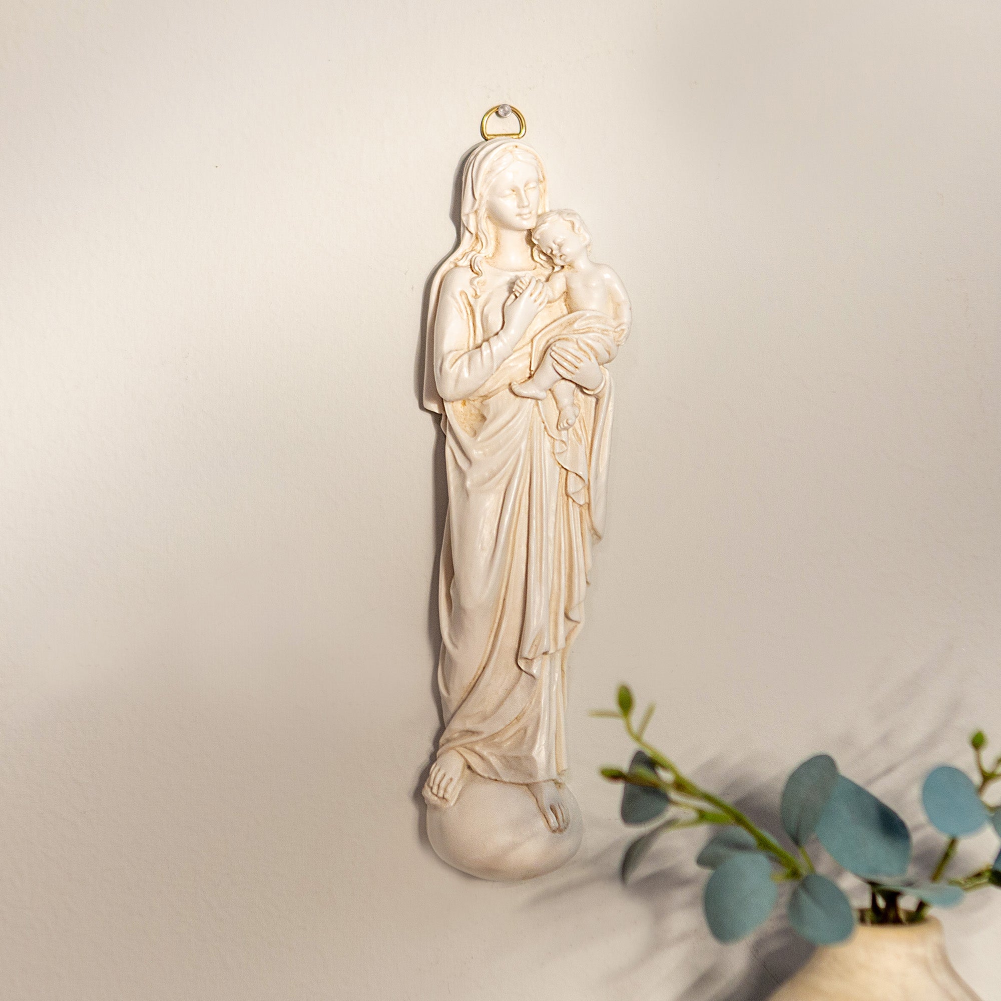 This beautiful Madonna and Sleeping Child Wall Statue features Our Lady gently holding the peacefully sleeping Christ Child. An Italian-crafted piece with a simple whitewash design, it brings a serene presence to any home. Complete with a wall hanger, it's a perfect gift that emphasizes devotion and reliance on Our Lady's intercession. Measures 8.5" high and weighs 0.6 lbs.