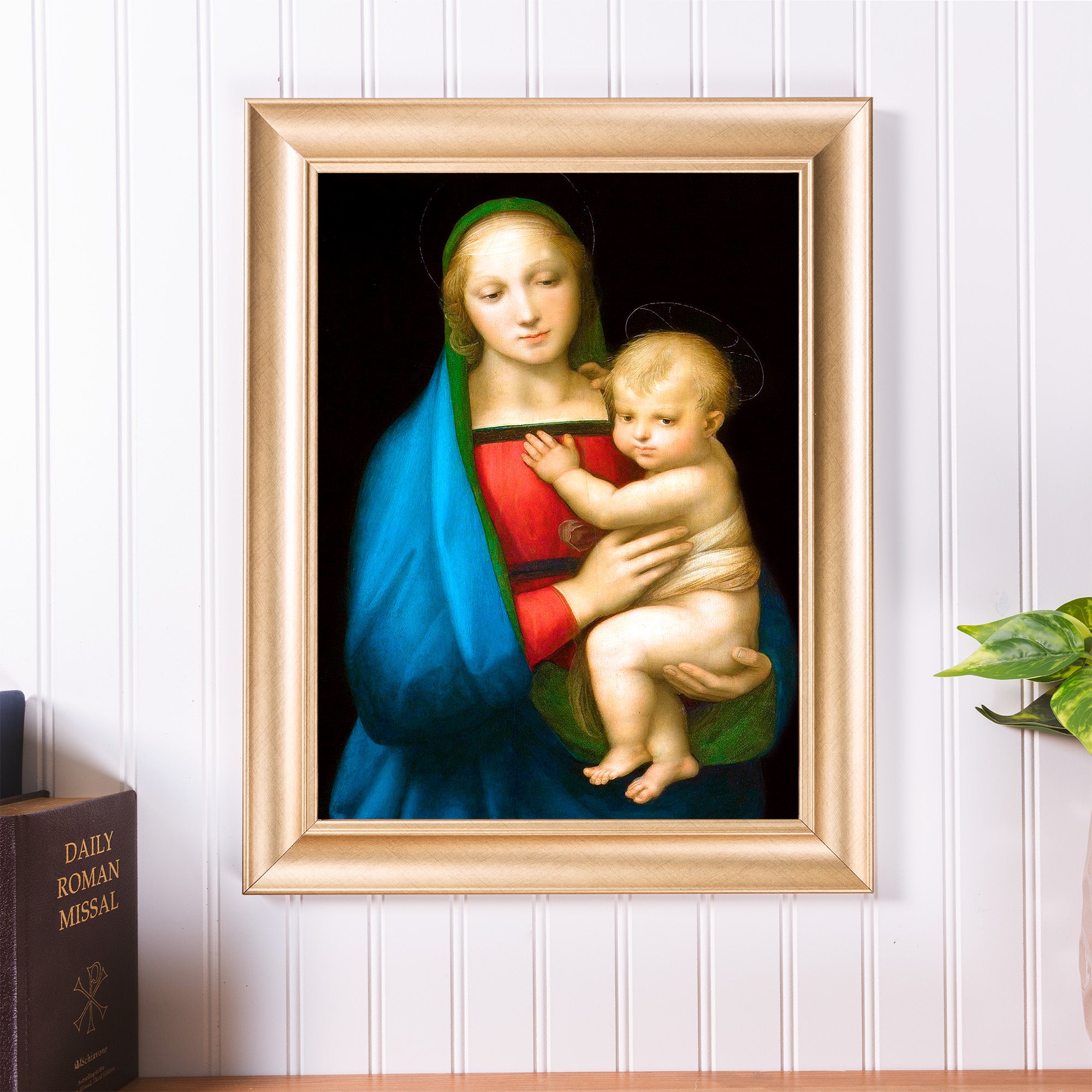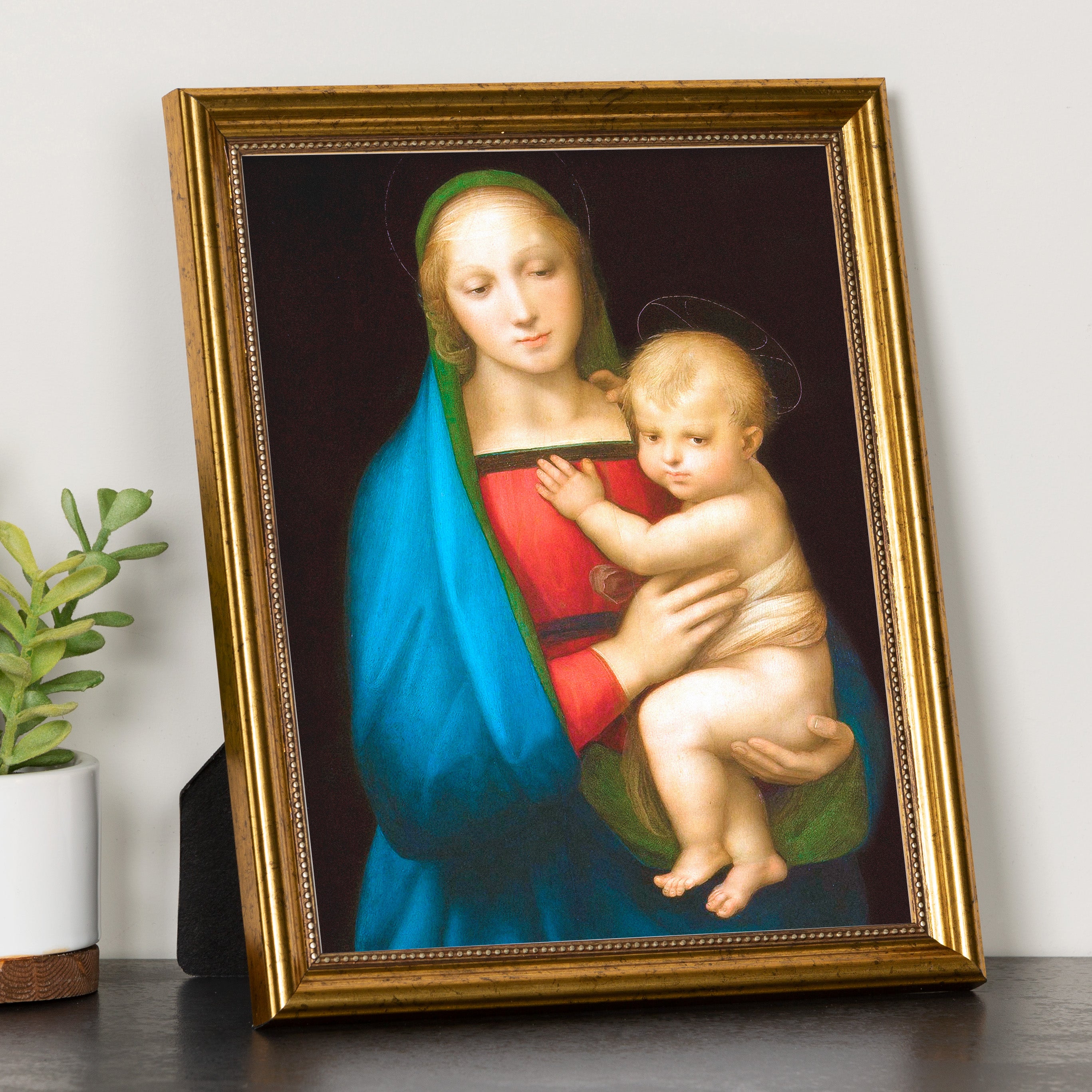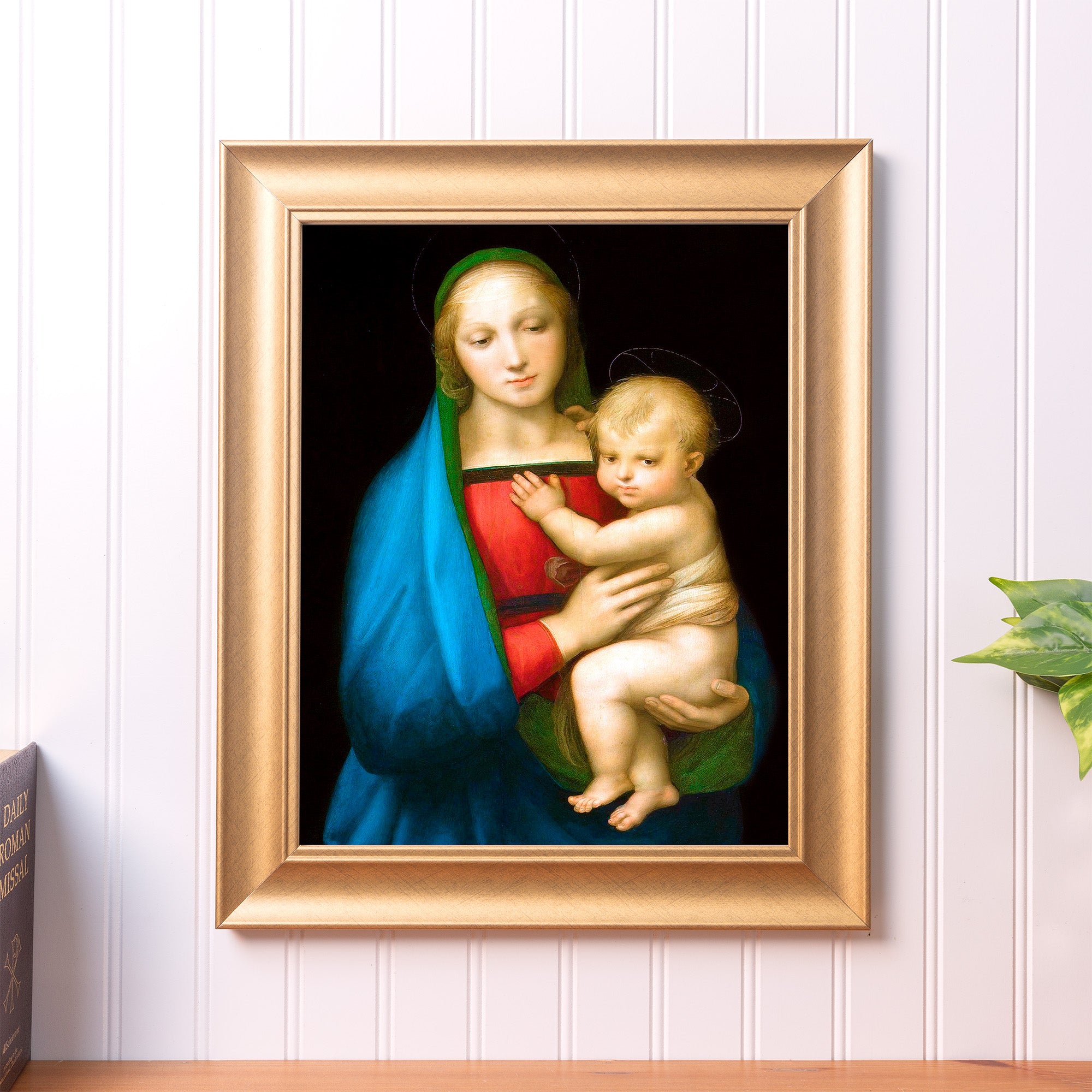 Experience timeless elegance with the Madonna Del Granduca Gold Framed Print, exclusively from The Catholic Company. This exquisite piece features Raphael's iconic painting, vividly rendered in rich color and framed in gold. Available in various sizes, it brings serene beauty and spiritual inspiration to any space. Celebrate the light of Christ and His merciful love with this distinguished artwork.