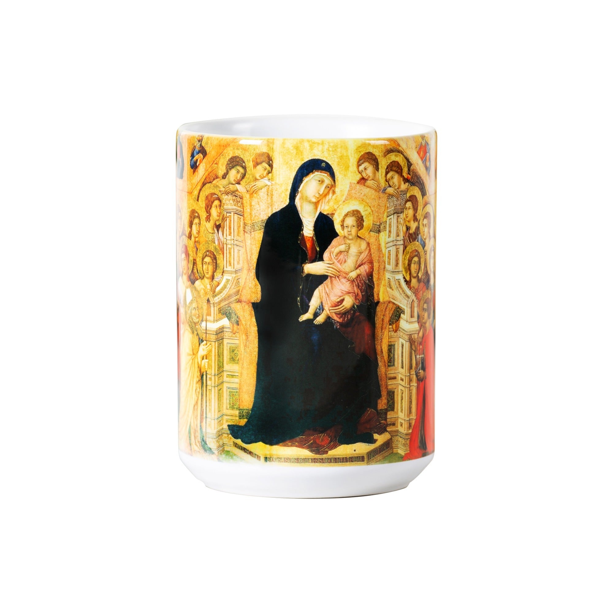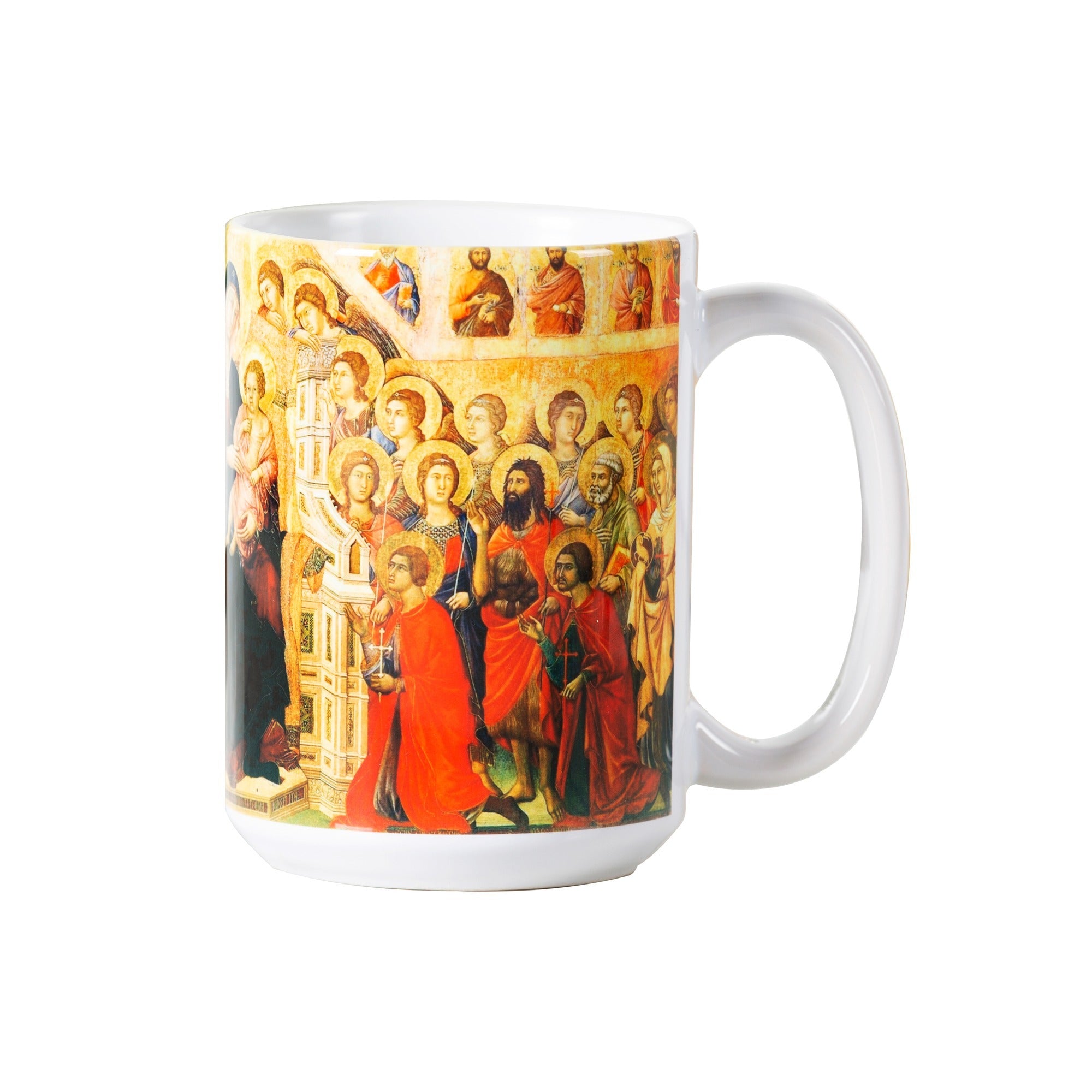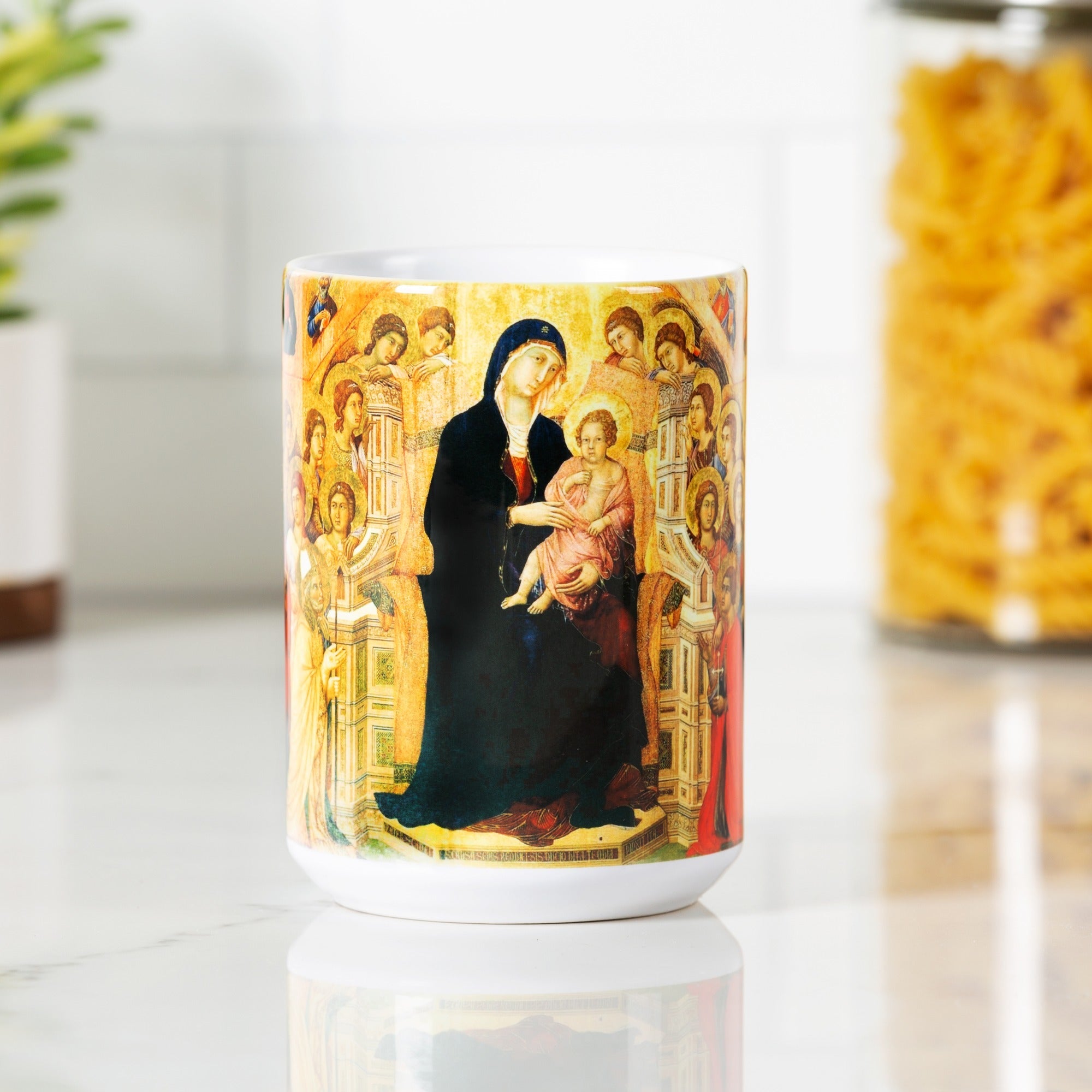 Experience the beauty of Duccio di Buoninsegna's Maesta Altarpiece with this 15-oz ceramic mug. Featuring the central image of "The Mother of God Enthroned," it offers a stunning way to enjoy your favorite drinks. Designed exclusively by The Catholic Company, this microwaveable mug makes a thoughtful gift for any occasion. Add a touch of inspiring art to your kitchen collection today!
