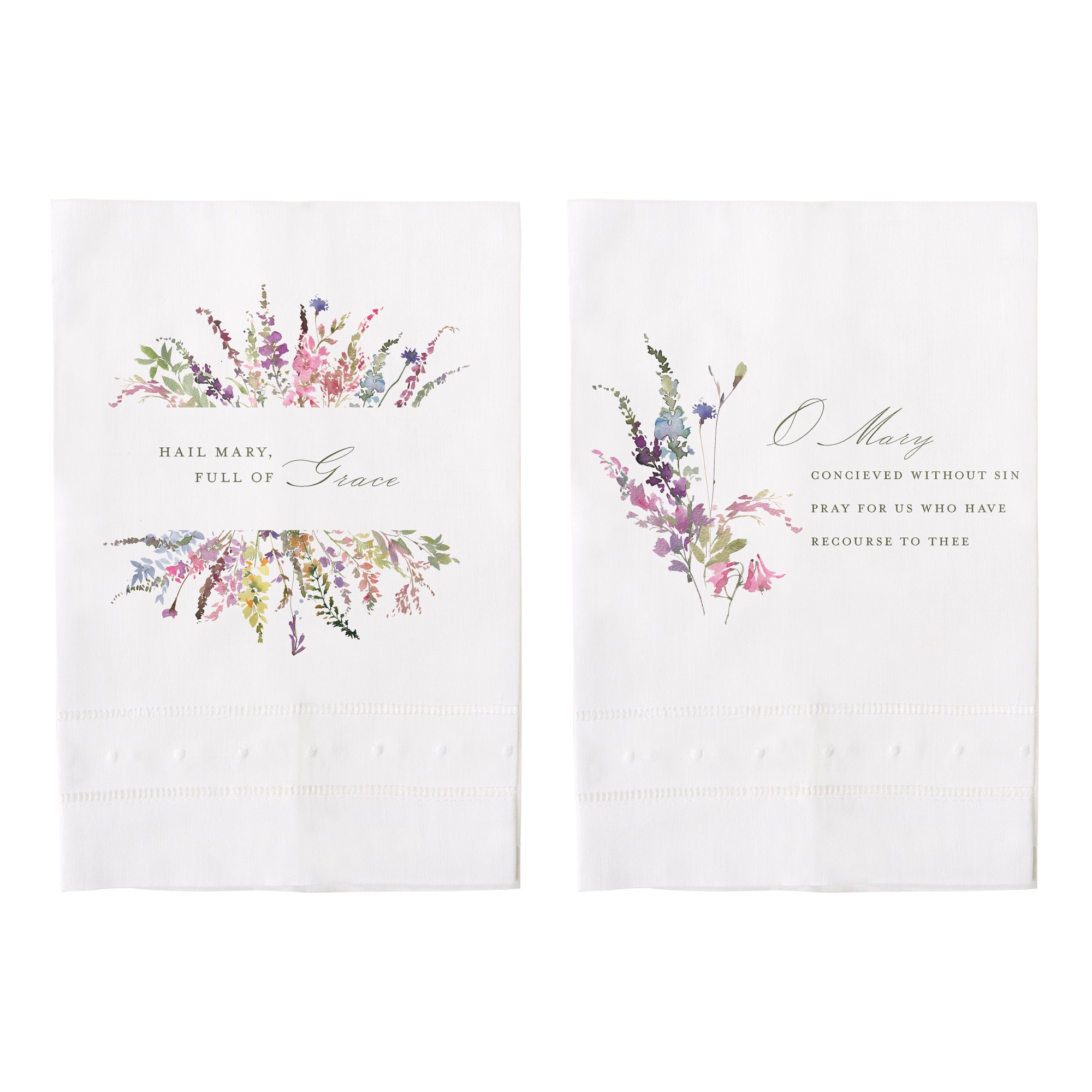 This set of two Marian Floral Linen Guest Towels features beautiful white linen adorned with vibrant watercolor blooms and artfully scripted quotes from the Hail Mary and the Miraculous Medal Prayer. Designed exclusively by The Catholic Company, these towels bring serenity and Mary's love into any home. Perfect as a Mother's Day, hostess gift, or to refresh your own elegant style.