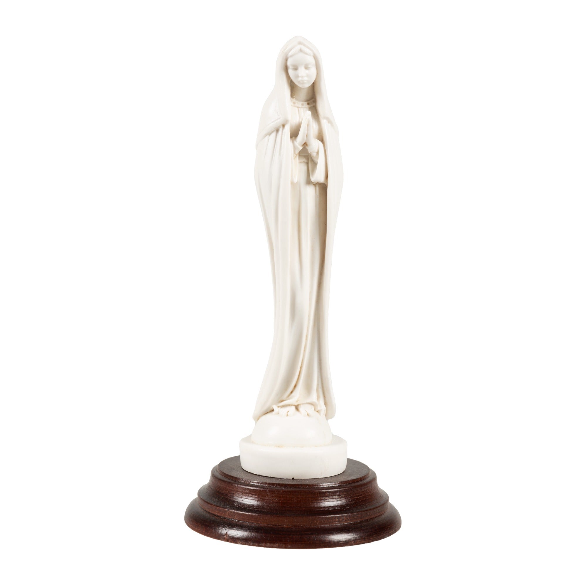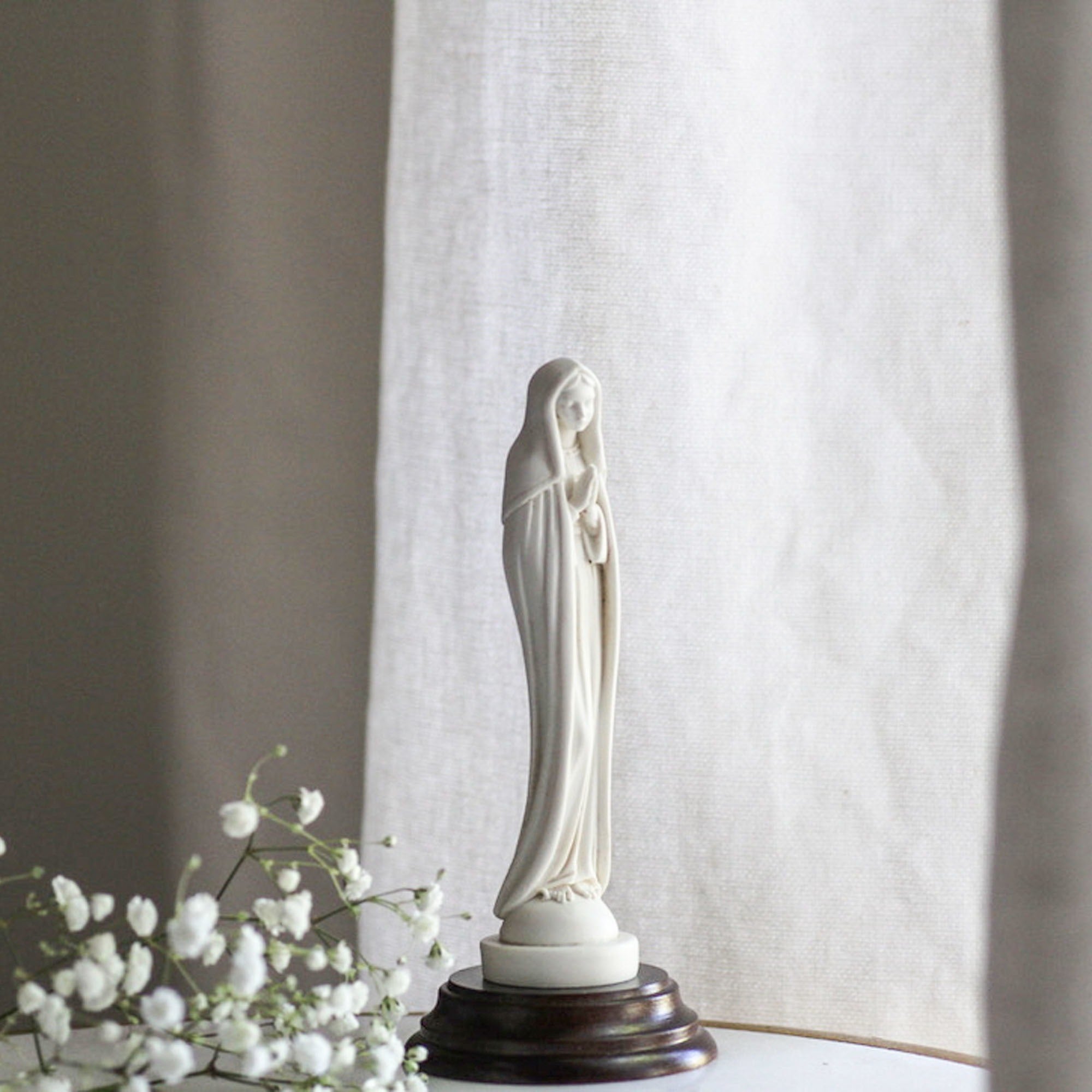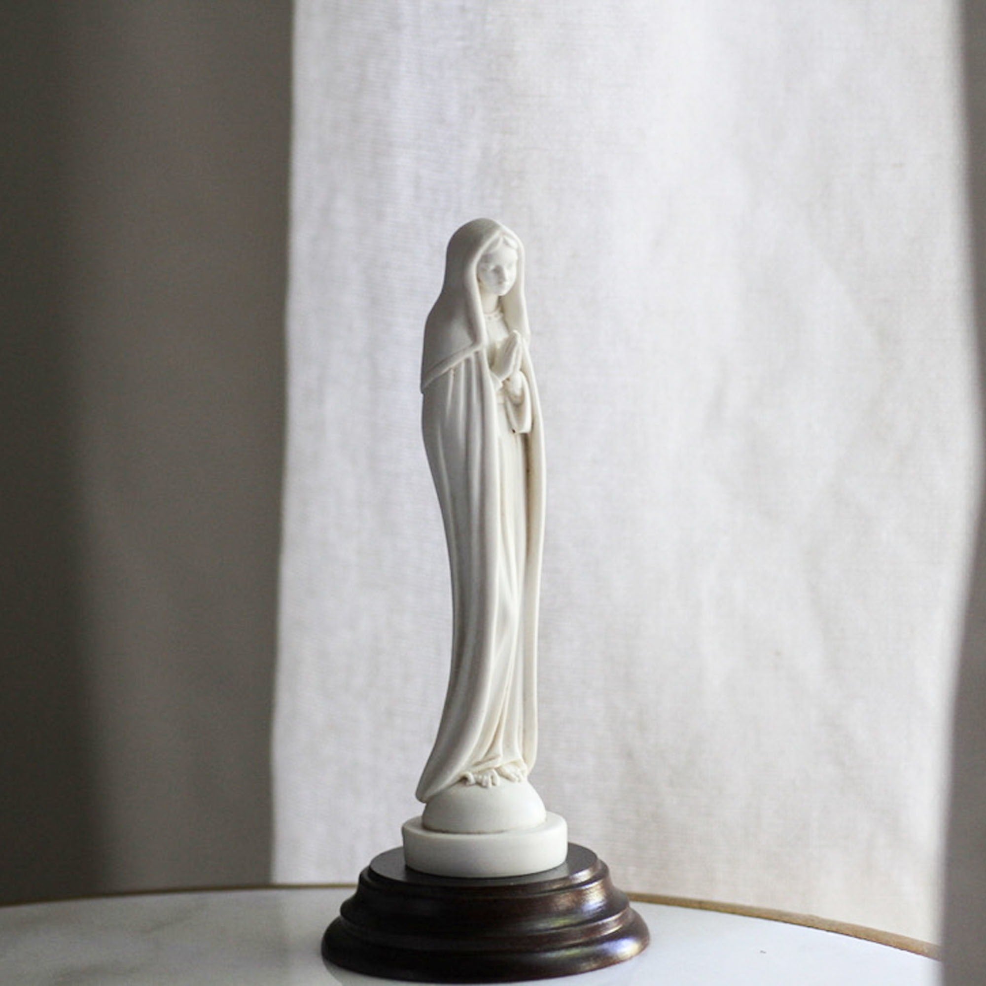 This elegant Italian-made Mary statue stands 7" tall with an ivory finish and dark wooden base. Its slender and serene design captures the innocence of the Blessed Virgin, making it a versatile Marian gift. Perfect for shelves or side tables, this piece brings peace to any room. A thoughtful gift for any occasion.