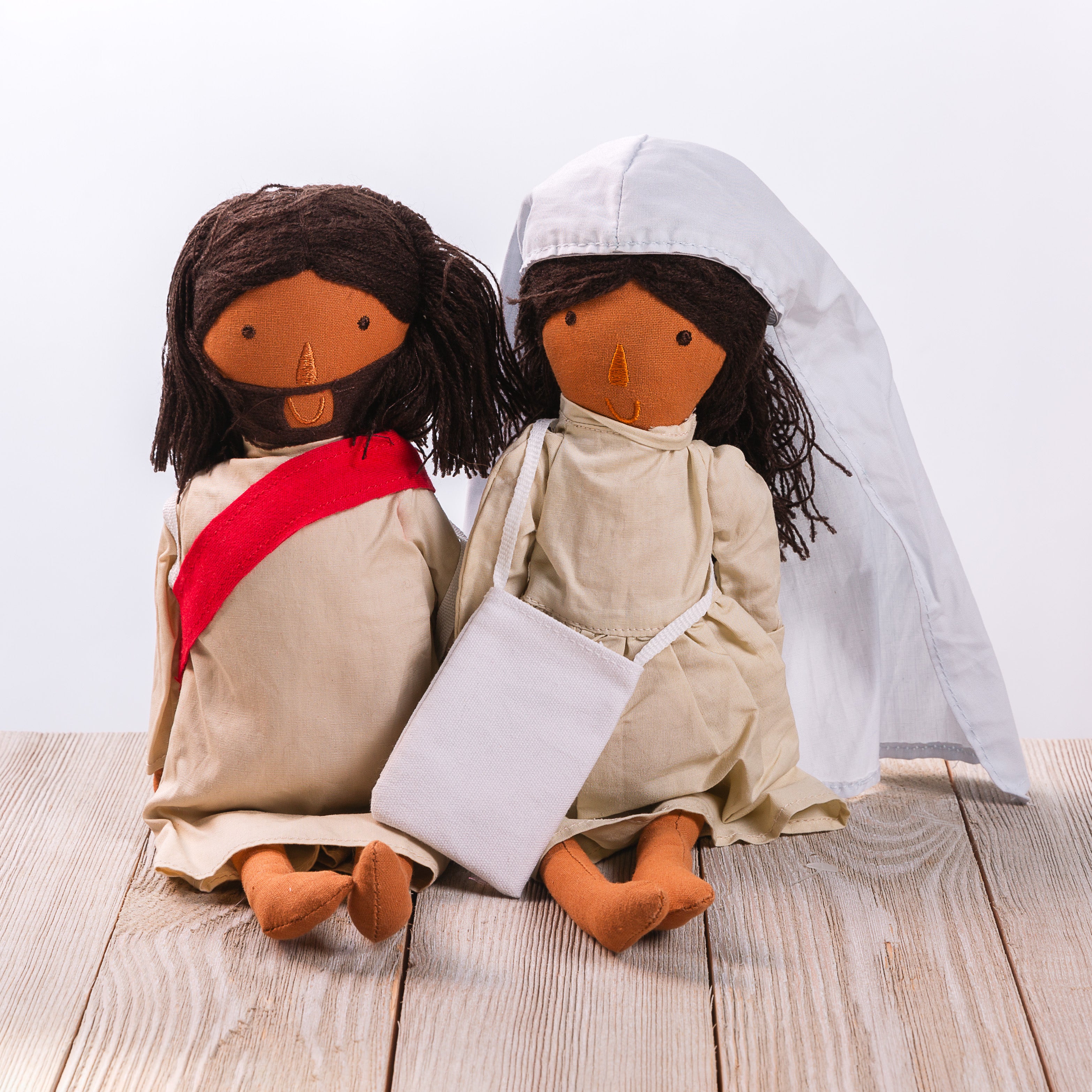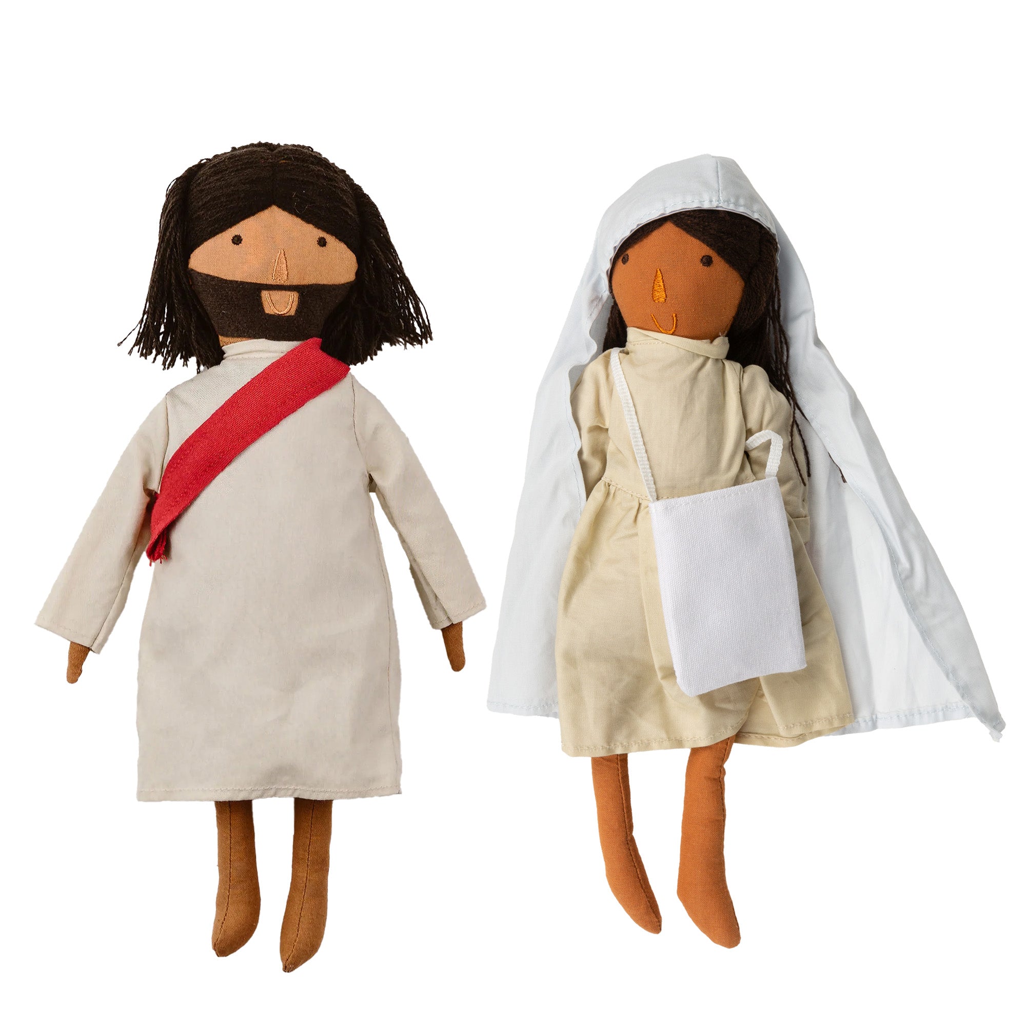 The Mary & Jesus Doll Set from Be A Heart offers plush, huggable dolls designed to nurture faith and devotion in children. The set includes a medium skin tone Mary doll in a beige dress and blue veil, and a handmade Jesus doll in a tunic with a red sash. Both feature embroidered details and a special message of love, making them ideal companions for ages 3 and up.