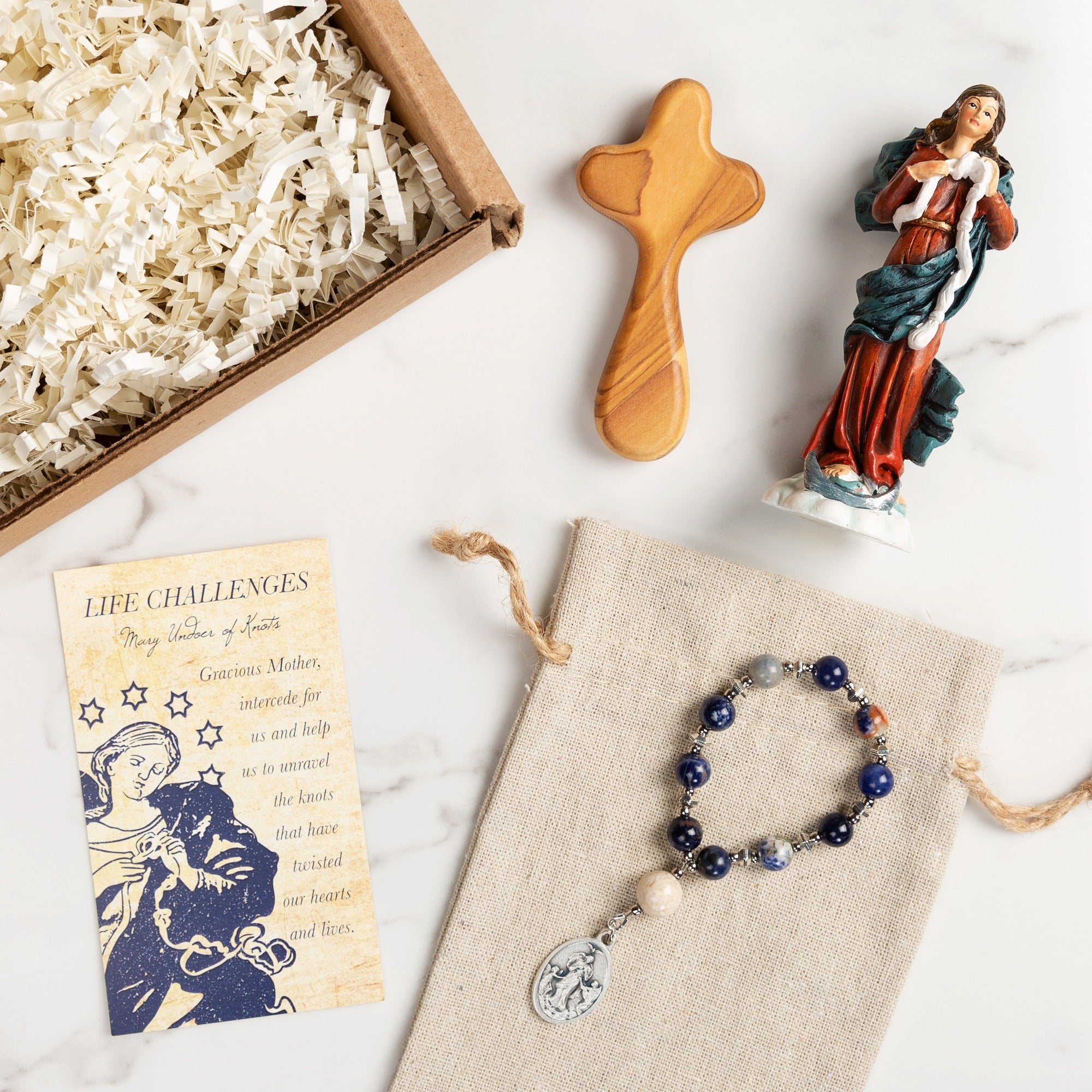 The Mary Undoer of Knots Healing Box is a 4-piece set designed to offer comfort and spiritual guidance during challenging times. Exclusive to The Catholic Company, it includes a palm cross, chaplet, and statue, all housed in a premium gift box. This collection fosters prayer and healing through devotion to Our Lady Untier of Knots, perfect for those seeking solace and strength.