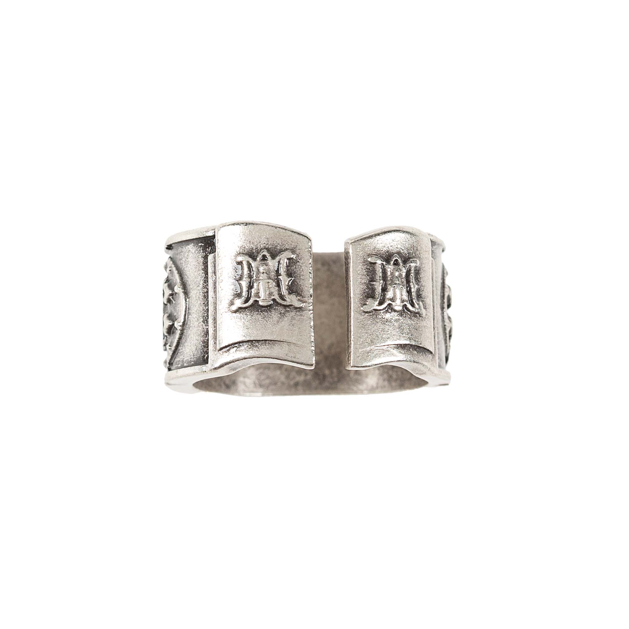This men's Miraculous Medal ring features a flat, masculine band with a ribbed edge in oxidized silver. The centered Miraculous Medal is flanked by its reverse image, while the Auspice Maria symbol, Mary's monogram, adorns the back. Available in various sizes, this Italian-made ring blends faith and devotion with style.