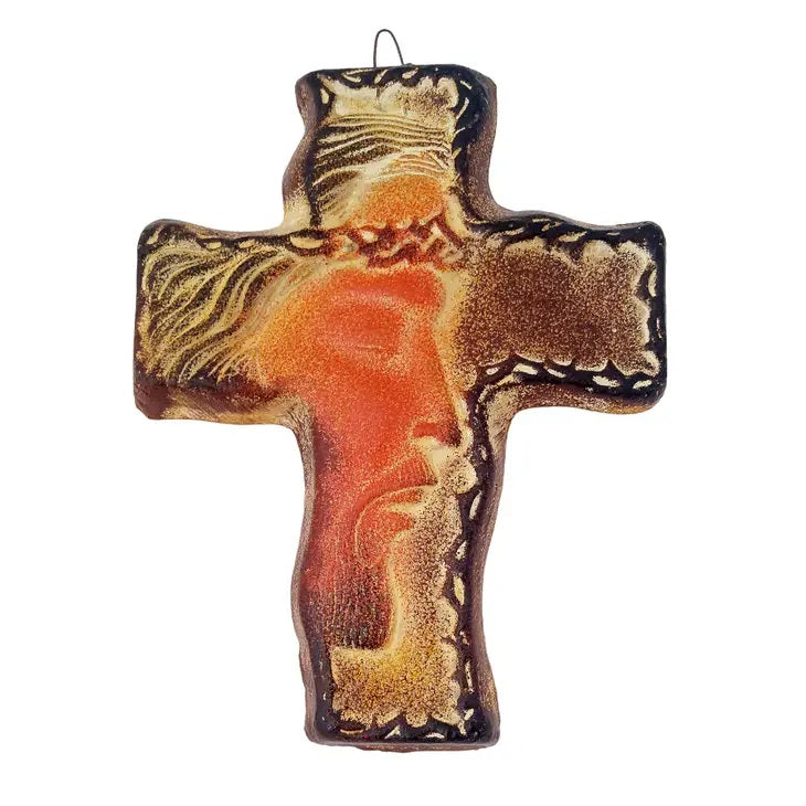 This handsome Wall Cross features a moving image of the Holy Face of Jesus, as He wears the Crown of Thorns. Hand made of Mexican pottery in rich earth tones, it is a beautiful gift for any sacred space. The Cross is an important image for a Catholic home, and makes a special Wedding or Housewarming gift and a meaningful accent for your own space. Handcrafted in Mexico.