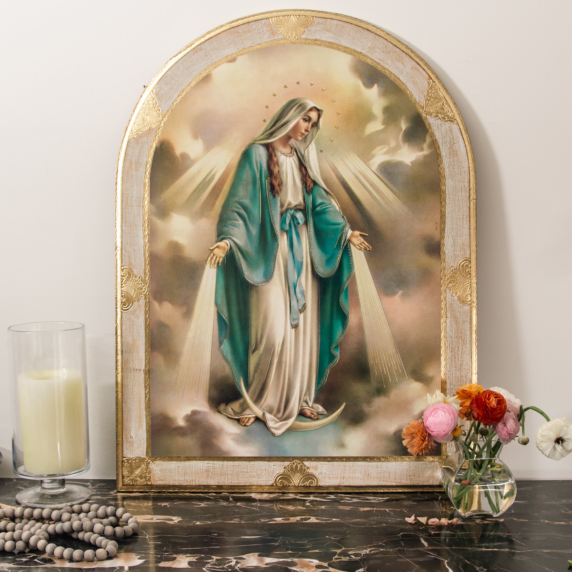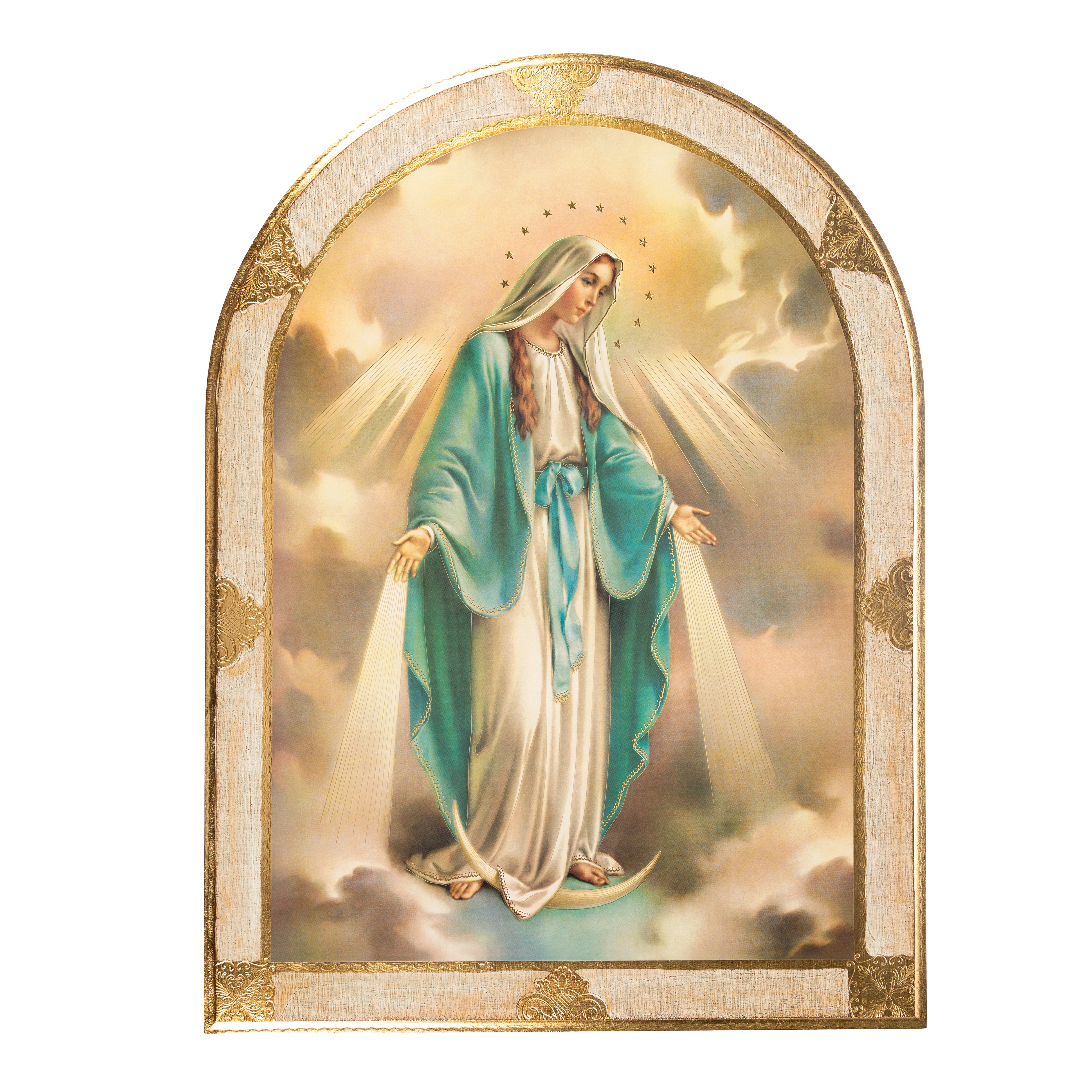 The Miraculous Mary Arched Florentine Plaque beautifully presents Our Lady of Grace in vivid colors with gold leaf accents. Crafted in Italy, its timeless arched design with scrolls and a whitewashed finish makes it a distinctive piece for any prayer or meditation space. This exquisite wood plaque, measuring 31" x 23", offers a heartfelt gift for those devoted to Our Lady of Grace.