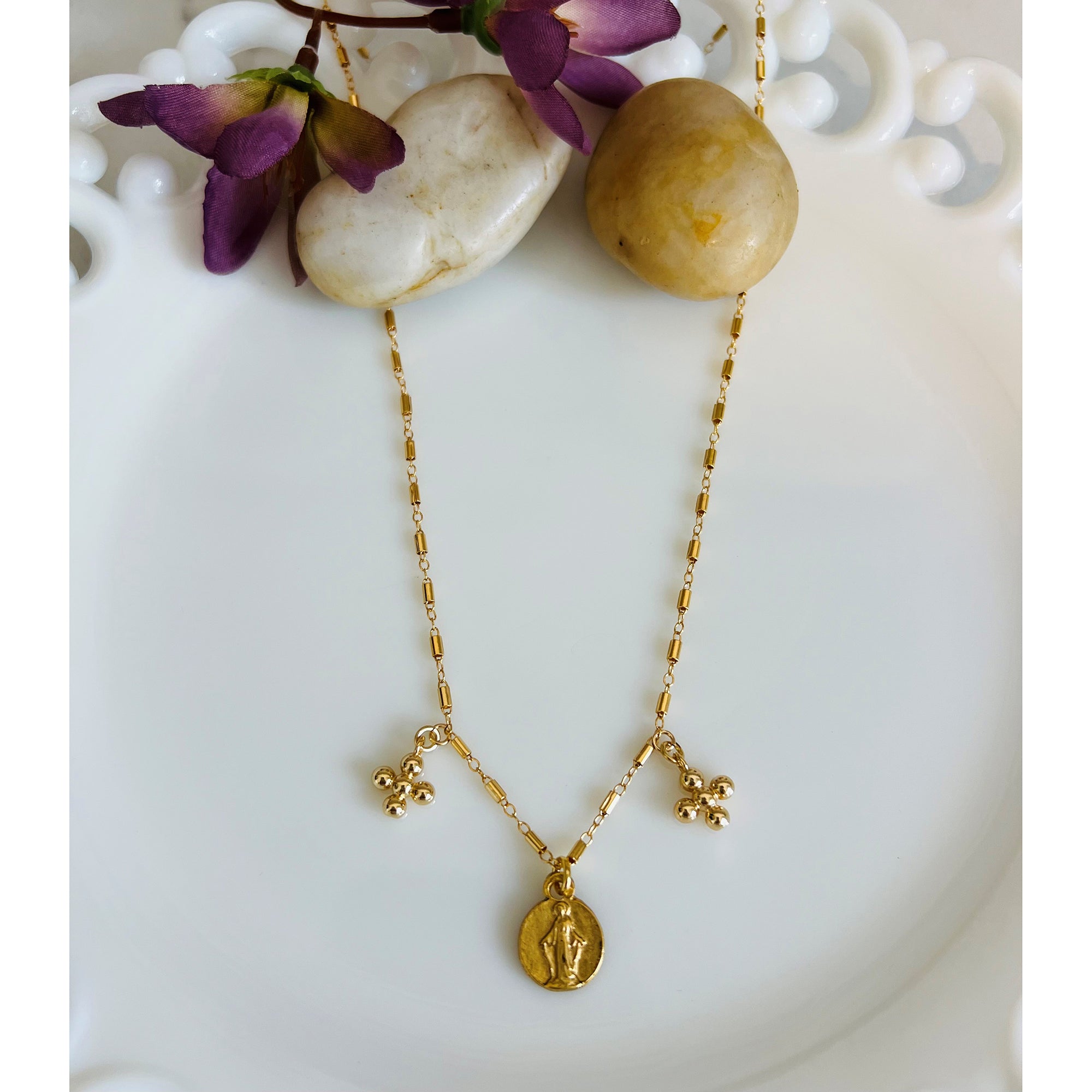 This ornate and distinctive piece features a chain that is distinctive, with a Miraculous medallion flanked by two puffy crosses for a look that is a contemporary twist on a vintage classic. The artisan's mission is to recreate antique pieces and continue sharing God's merciful love as the jewelry travels through time.