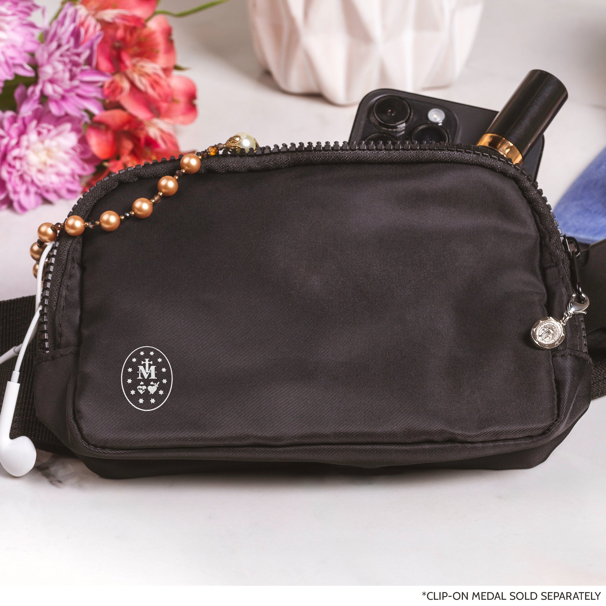 The Miraculous Medal Belt Bag from The Catholic Company combines style, faith, and functionality. Featuring a black design with a Miraculous Medal insignia, it's perfect for on-the-go organizing as a belt bag or crossbody. With interior and exterior pockets, it's ideal for busy individuals seeking convenience and elegance. A thoughtful gift for Catholic women, it matches seamlessly with any outfit.