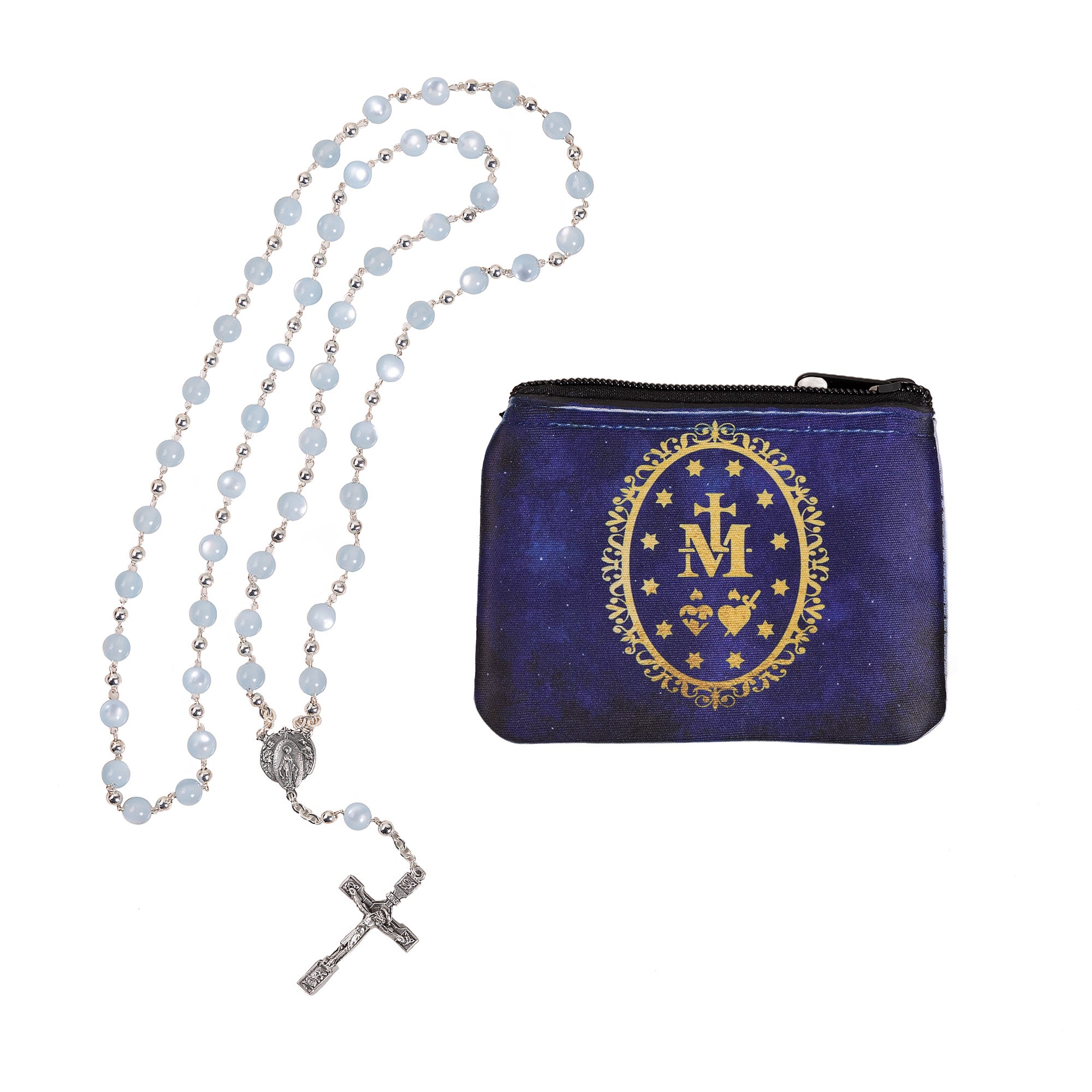 This exquisite Miraculous Medal Chaplet & Rosary Pouch Set features serene blue crystals with a matte finish, a unique crucifix, and a beautifully detailed centerpiece. Perfect for a Catholic loved one, the set includes a chaplet and a personalized rosary pouch with a celestial design. Accompanied by a holy card and instruction pamphlet, it makes a meaningful devotional gift. Made in Italy.