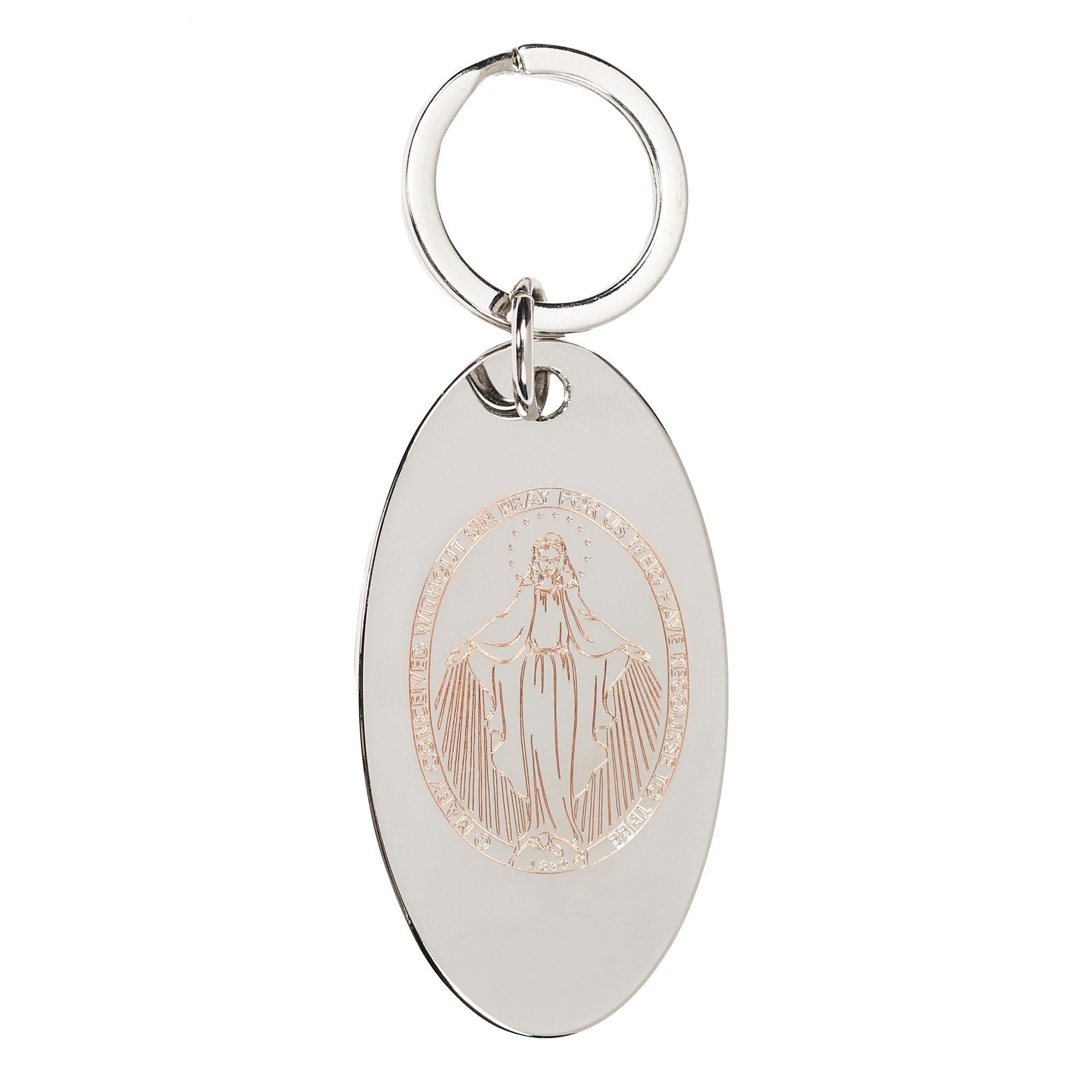The ever-popular Miraculous Medal is now featured on this attractive silver keychain. A practical accessory for anyone with devotion to the Blessed Mother. Let this Marian keychain be a constant reminder of her love and the graces that flow from her Immaculate Heart on your daily journey. Engraved name on reverse side.