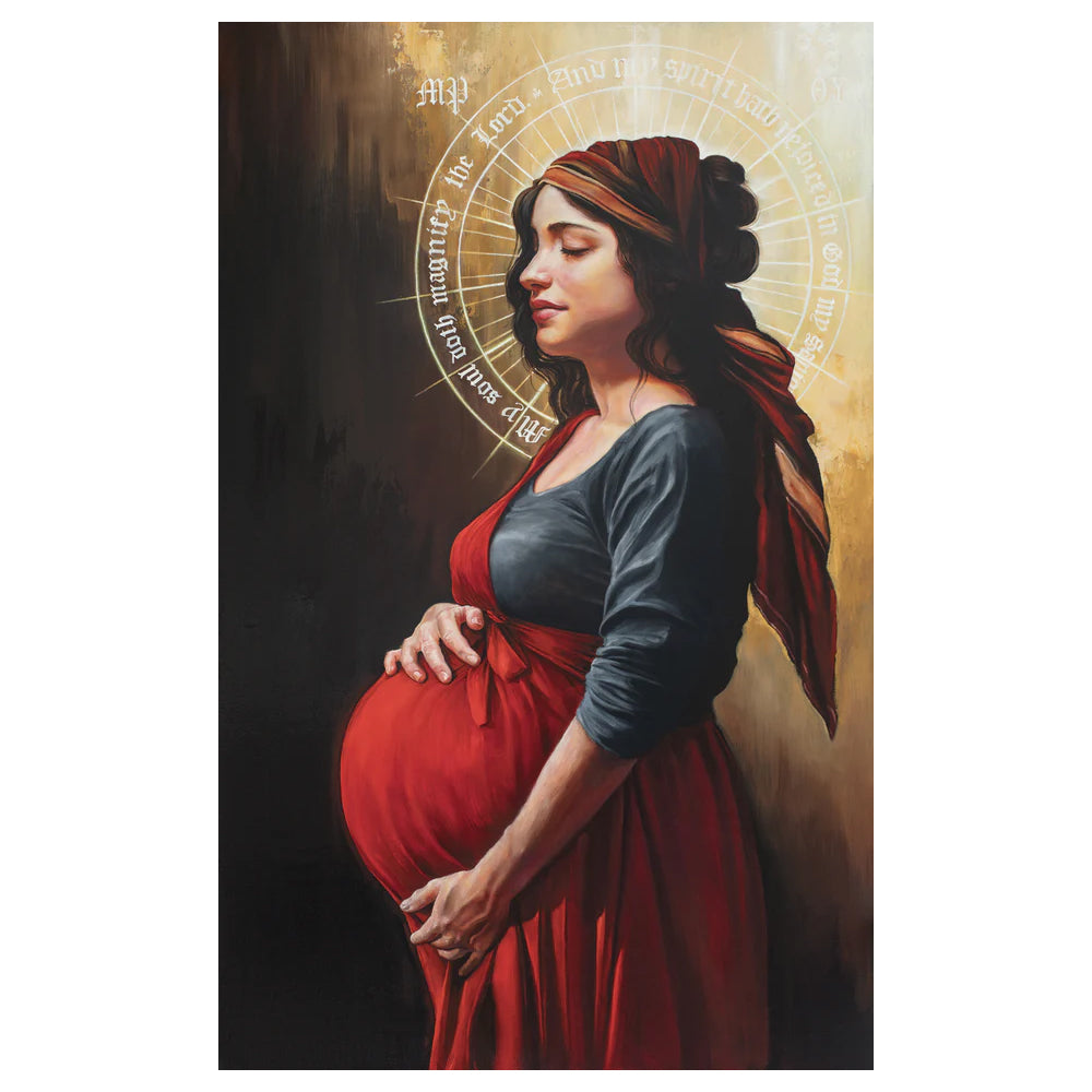 features the Mother of God, as she tenderly embraces the child in her womb, contemplating what is to come. A radiant halo encircles her head, symbolizing her sanctity, while the words of the Magnificat gracefully encircle her visage, reflecting her joy and hope.