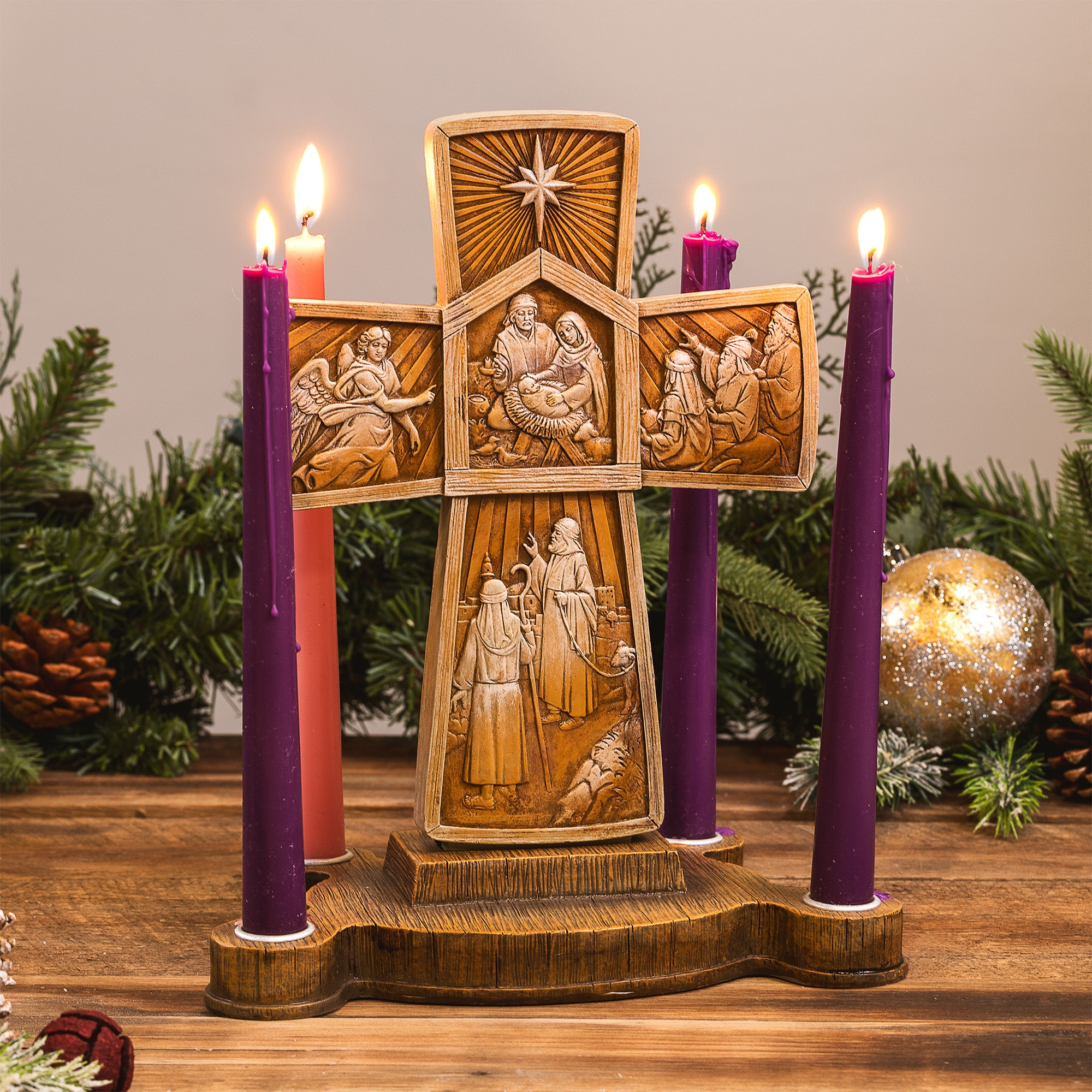 The Nativity Cross Advent Candleholder offers a beautiful addition to your holiday reflection and anticipation. Finished in antique gold with a wood-look made of resin, it features nativity scenes on a cross centerpiece. Designed for Advent candles placed in the outer ring, it stands 12" high, enhancing your spiritual preparations. Note: Candles are not included.