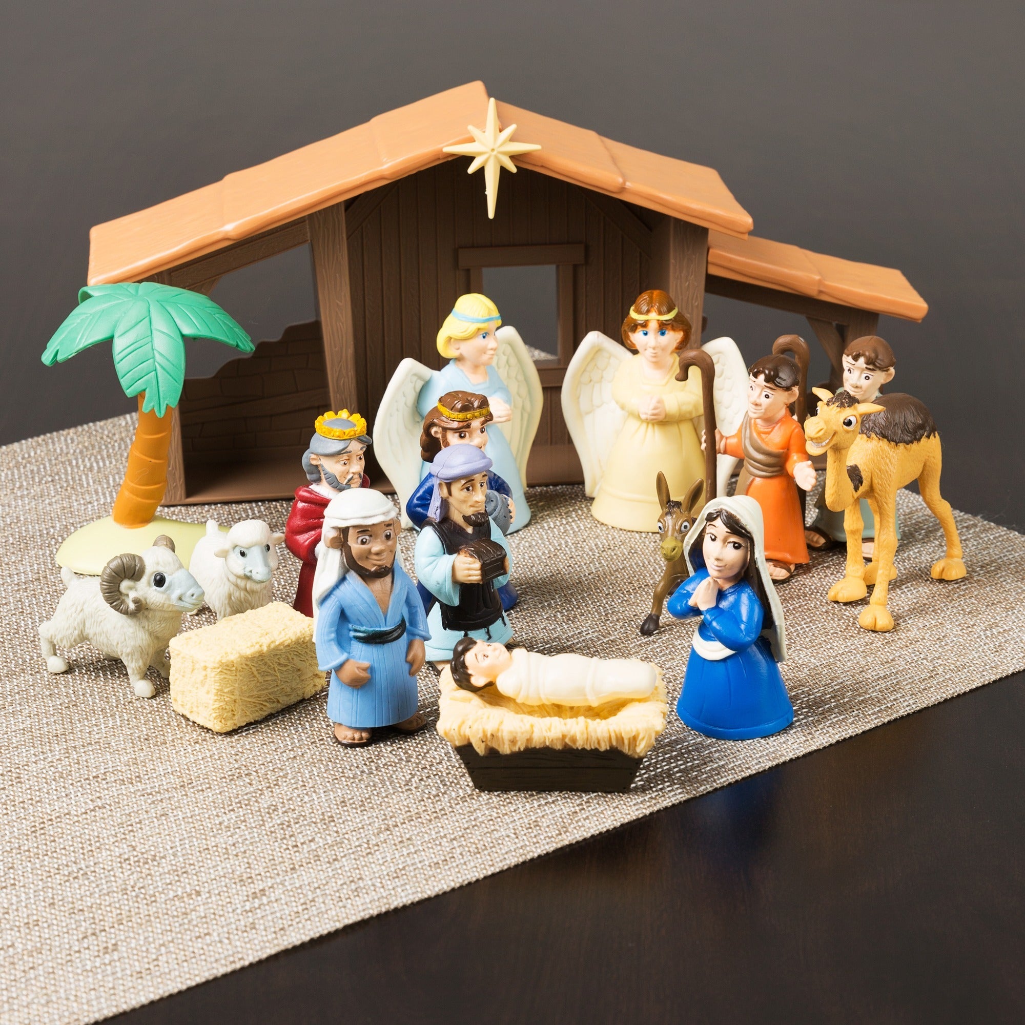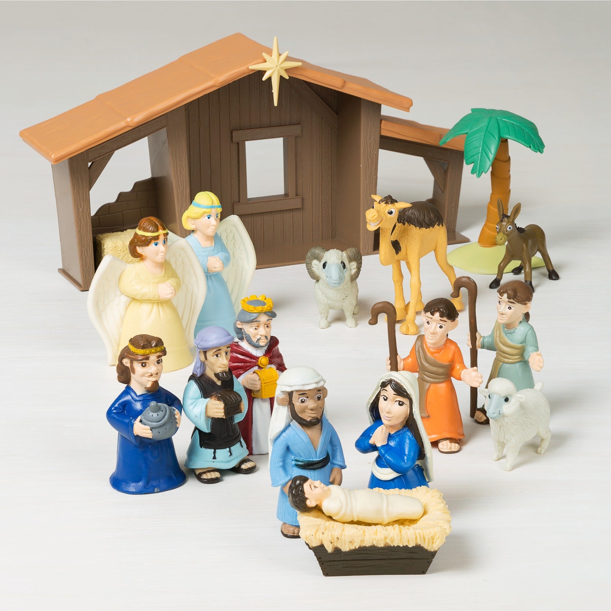 Children can bring the story of Jesus' birth to life with this charming children's toy Nativity Play Set. The complete collection features a mini storybook describing the birth of Christ and 17 toy pieces ideal for little hands to play with and learn from. This toy nativity set is sure to bring hours of fun play to your kids as they reinact the Christmas story for themselves. A great way to help your children begin a devotion to Jesus!