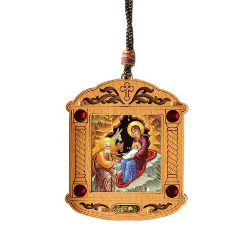 An elegant image of the Nativity made as a miniature icon shrine, in the tradition of ancient Russian iconography. Features a petite wooden frame, embellished with engraving, jewels and encased grains of incense to represent prayerful offerings. Hangs on an adjustable cord that can be used anywhere from your car, doorknob, wall, desk, Christmas tree, or any sacred space. A distinctive and holy gift of sacred tradition perfect for anyone on your Christmas list.