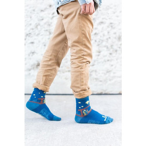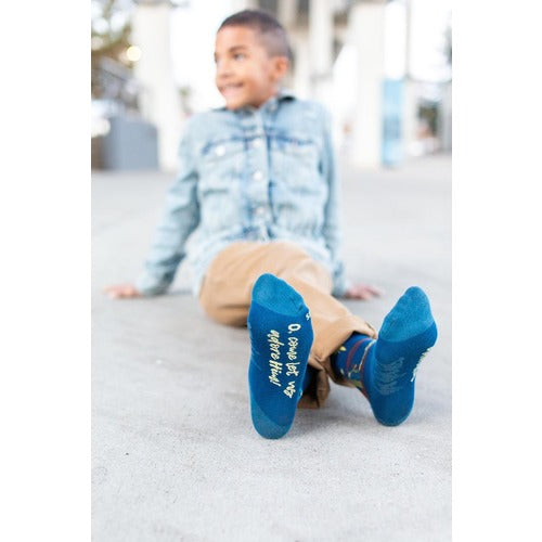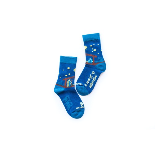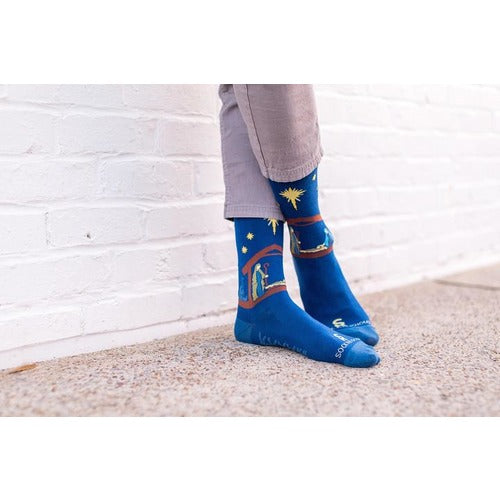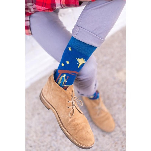 These vibrant Nativity Socks are adorned with blue, brown, gold, and white shades, featuring the Nativity scene and the message "O' Come let us adore Him!" A perfect, unique gift to share the joy of faith year-round, they serve as a reminder of Jesus' humility and love. Available in Adult and Youth sizes, they're made from a comfortable cotton, nylon, and spandex blend.