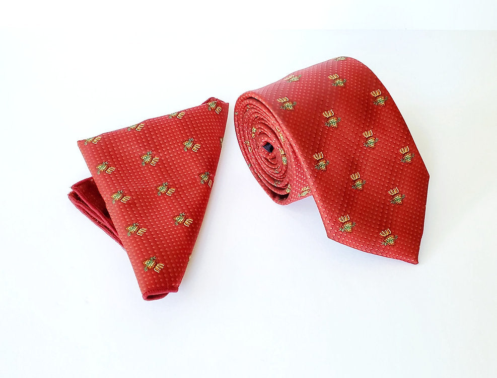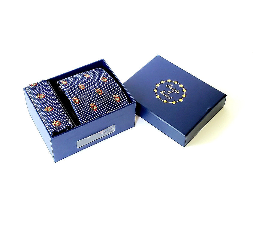 The Men's Sacred Heart Tie & Pocket Square Set is a handsome, handmade accessory honoring the Sacred Heart of Jesus. Featuring subtle dots and repeating Sacred Heart designs in red, orange, gold, and green, it is available in Navy or Red. This silk set, dry-clean only, offers a touch of faithful elegance. Gift boxed and ideal for him.
