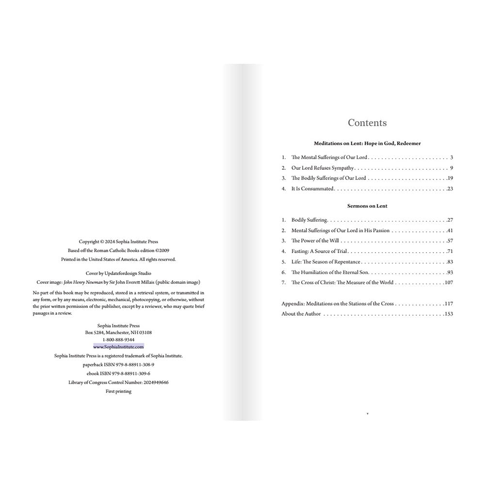 This work features three of Cardinal Newman’s most esteemed classics: Meditations on Lent: Hope in God, Redeemer; Sermons on Lent; and Meditations on the Stations of the Cross. In these pages, he invites you to ponder the eternal value of suffering, God’s infinite love for each individual soul, the real reasons for fasting, and why you should repent now.
