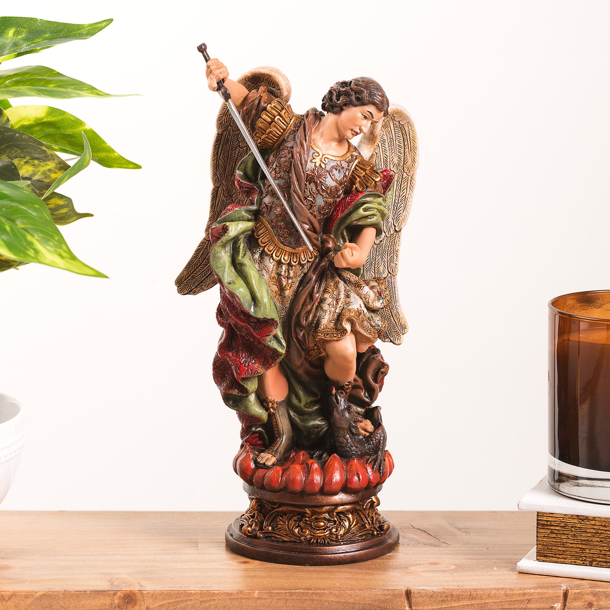Tender sculptural detailing and fluid design movement combined with an elegant ornamental base make this a lovely piece for display and devotion and a perfect gift for those devoted to the Prince of Angels, especially emergency workers, first responders, police, and those in the military.