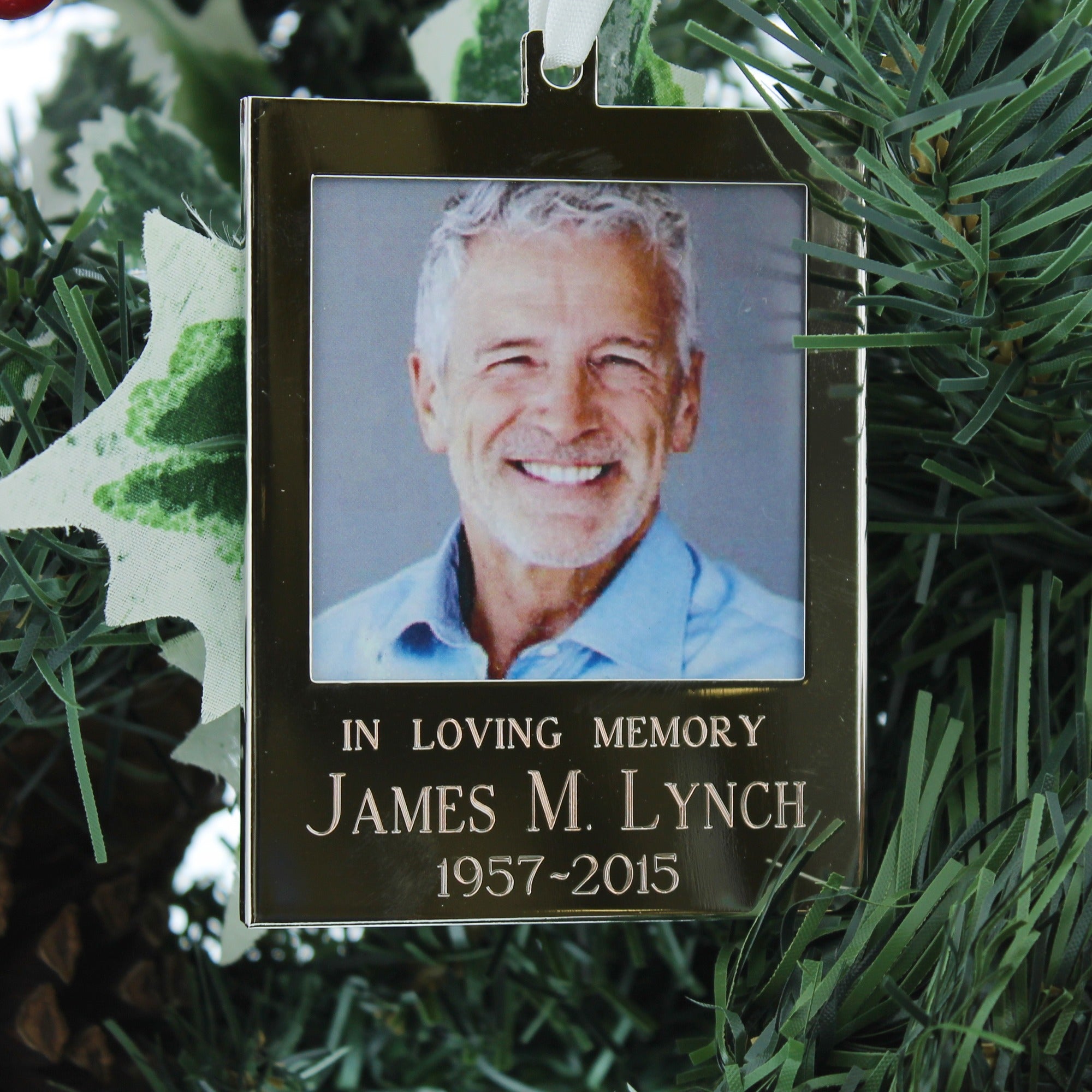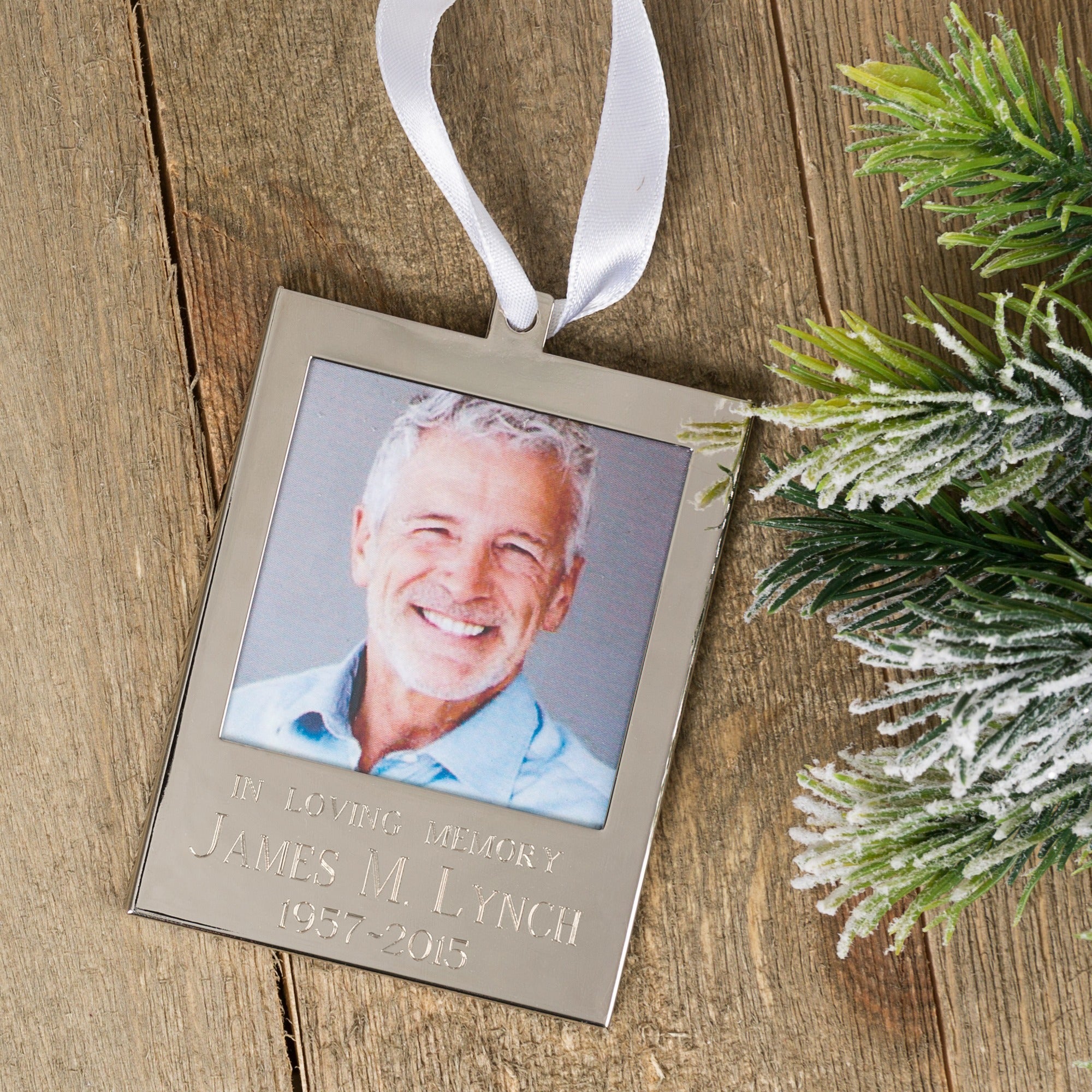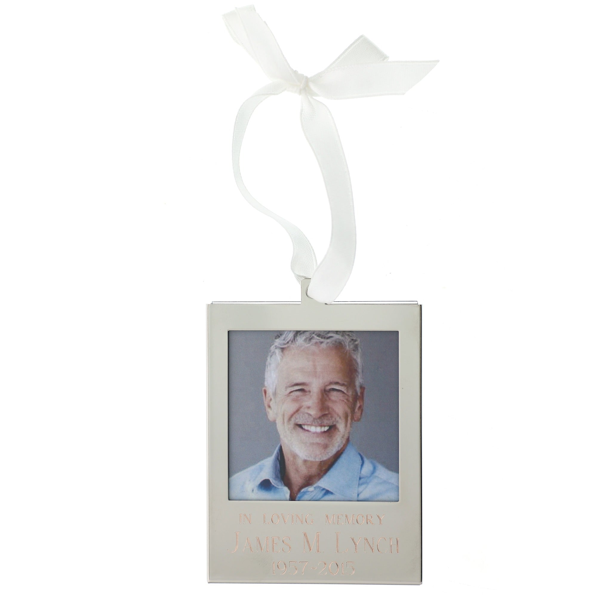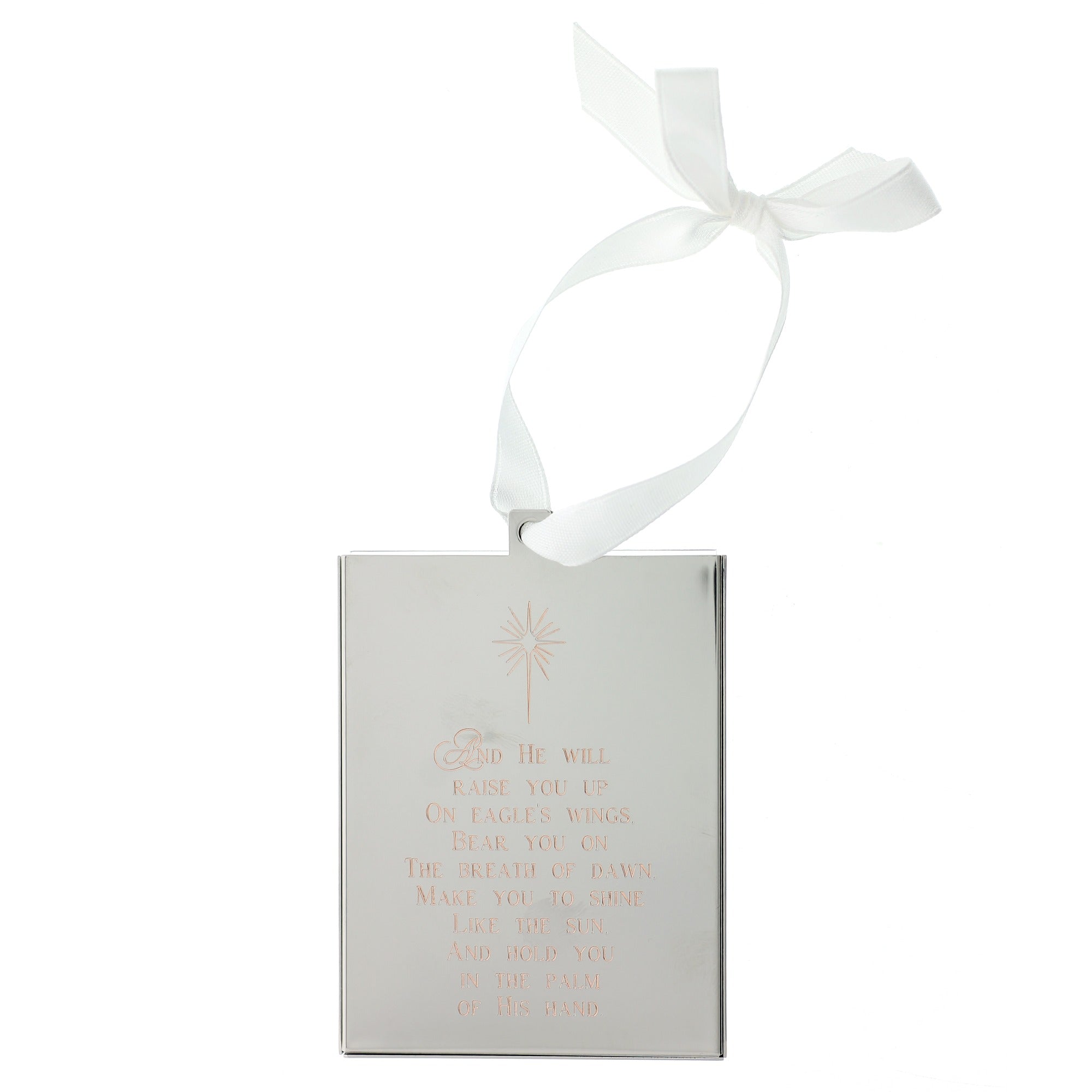 This silver finished keepsake memorial ornament is a thoughtful way to celebrate the life of a loved one. Display a cherished photograph during the year as you keep their memory alive. Includes an engraved name and date. Reverse side features the words to they beloved Catholic hymn,  "And He will raise you up on eagle's wings, bear you on the breath of dawn, make you to shine like the sun, and hold you in the palm of His hand." Includes white satin ribbon. Boxed for gift-giving. Exclusively designed by The Catholic Company- Because Faith Matters.