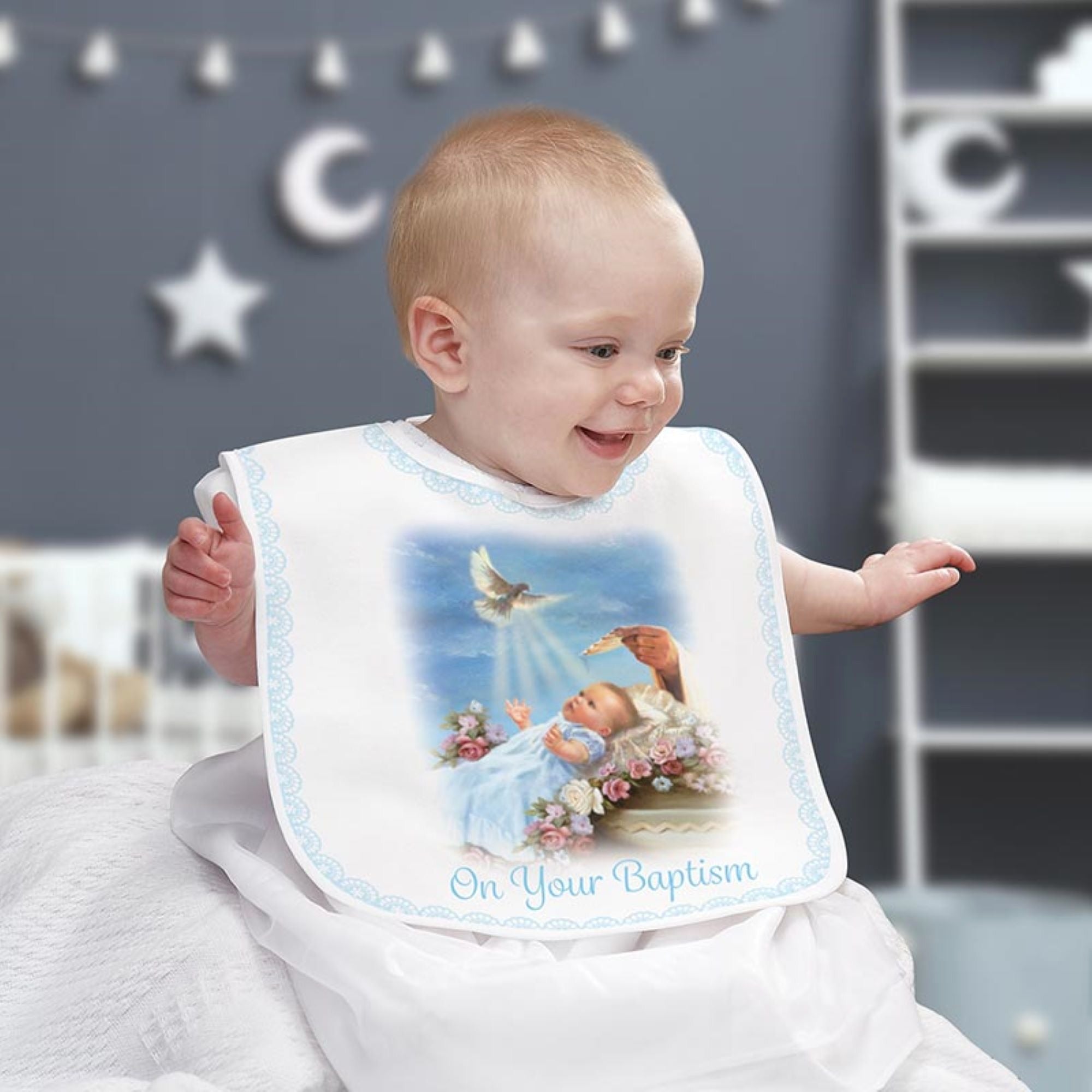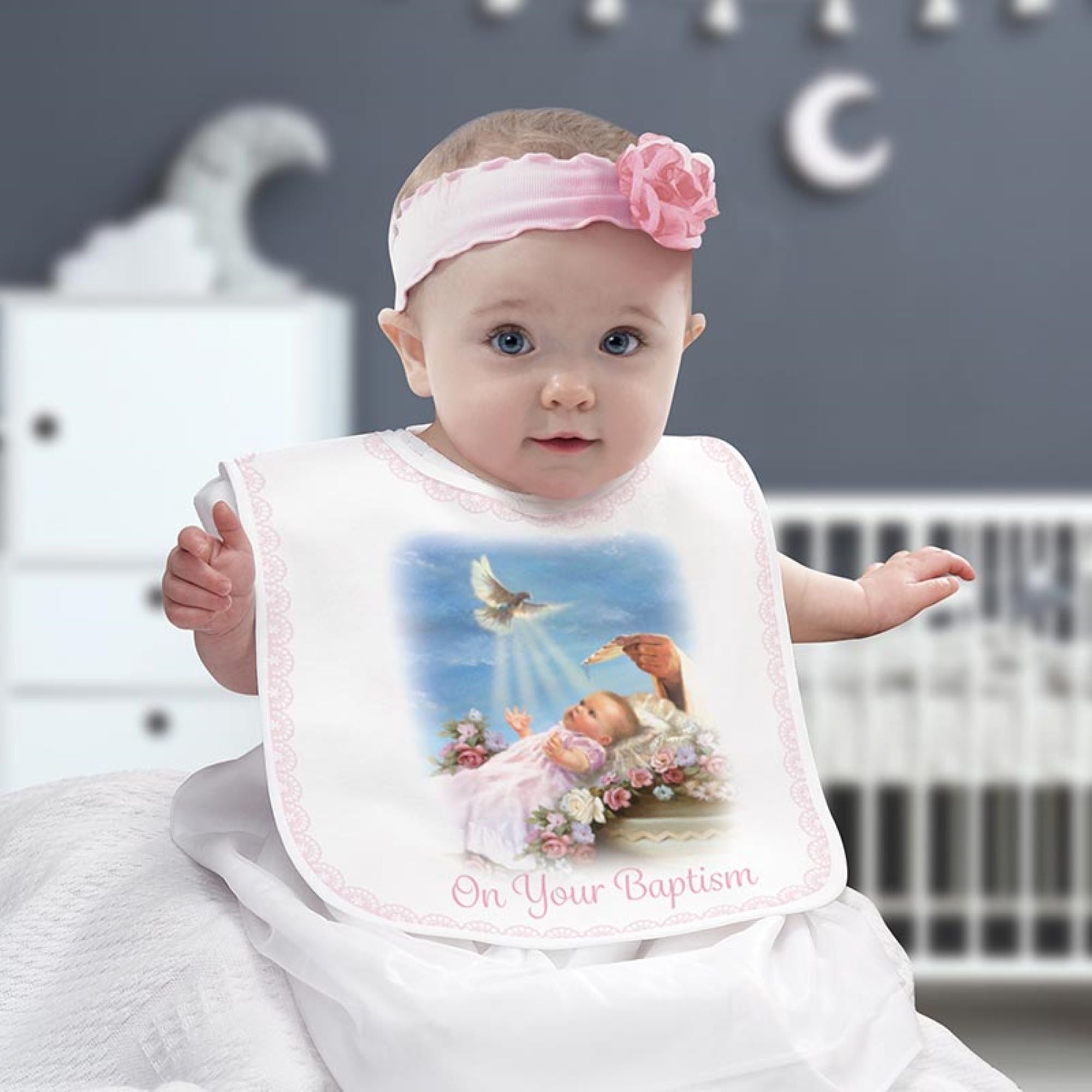 This traditional baptismal bib is suitable for boys or girls and features a smooth weave polyester fabric with a digital print. It includes a Velcro closure at the back of the neck for easy wear. Machine washable and sold as a pack of 6, each bib measures 12" x 16".