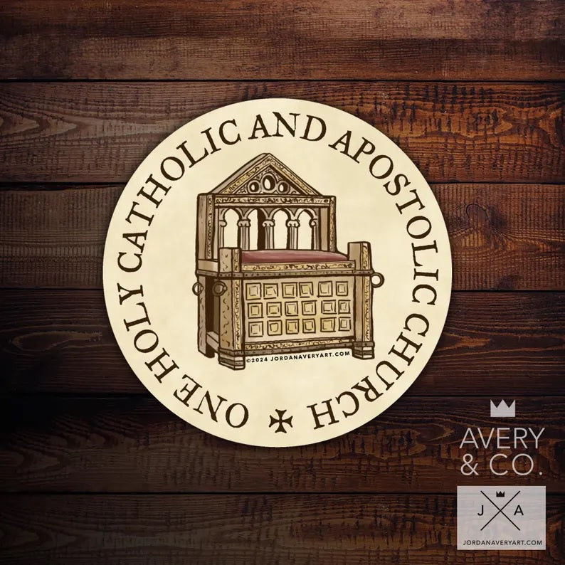 Celebrate the unshakable foundation of the Catholic Church with this Chair of Saint Peter vinyl sticker, boldly featuring the Four Marks of the Church: One, Holy, Catholic, and Apostolic.