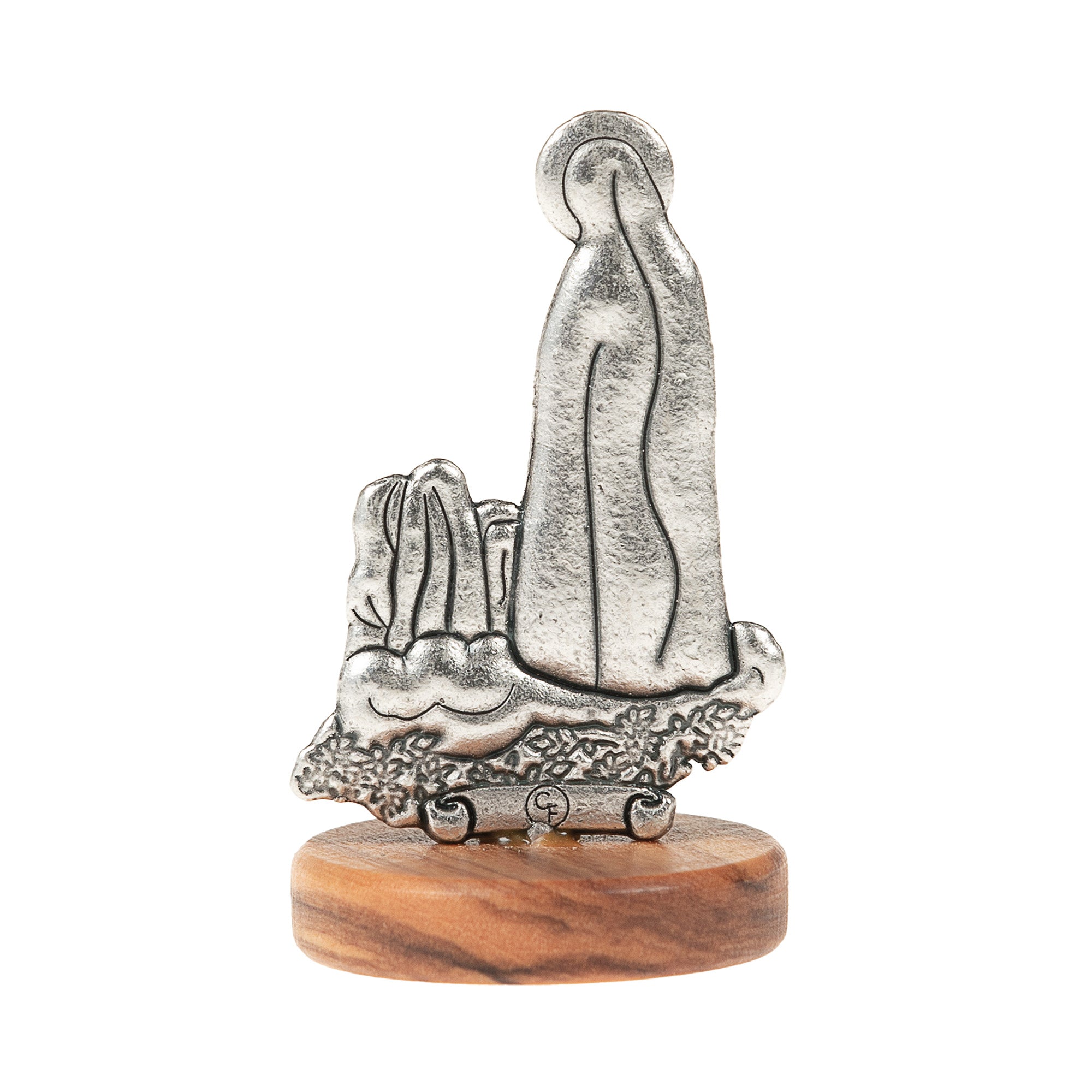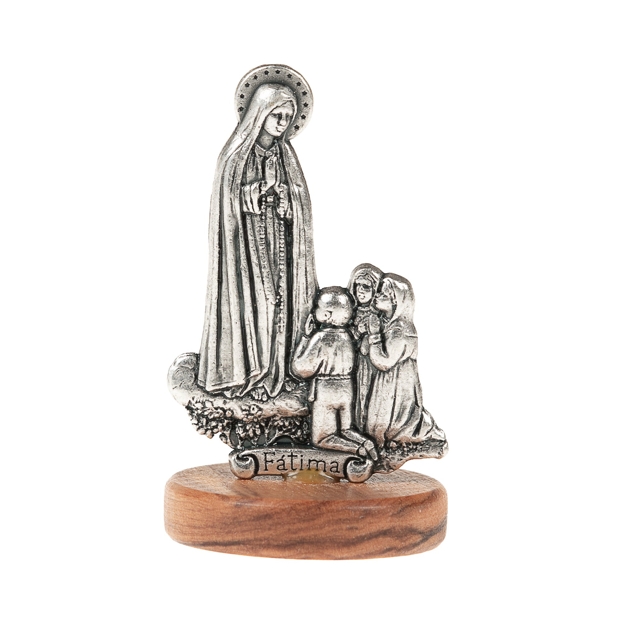The 2" Our Lady of Fatima Figurine, crafted from oxidized silver and set on an olive wood base, depicts Our Lady's apparition to the shepherd children of Fatima. This unique and portable piece is perfect for any small space like your home, desk, car, or for travel. Keep this Italian-made devotional item close to inspire your spiritual journey.
