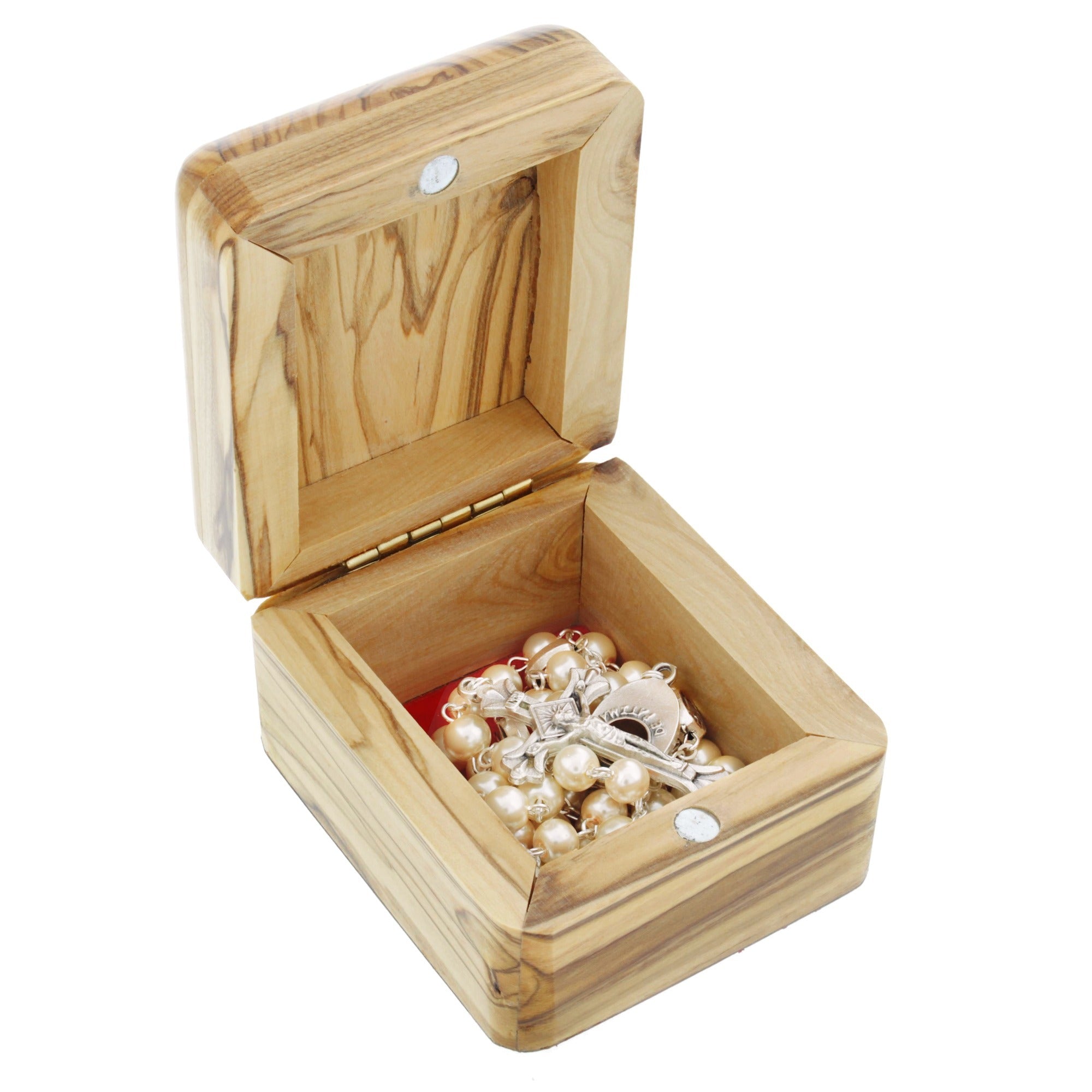 Celebrate the 100th anniversary of Fatima with this beautiful devotional set. The handcrafted olive wood rosary box, made in Bethlehem, holds a pearl-style beaded rosary adorned with Our Lady of Fatima medals. This set is a meaningful connection to the Holy Land and a thoughtful gift to inspire prayer and reflection on the Blessed Mother and the Mysteries of the Holy Rosary.