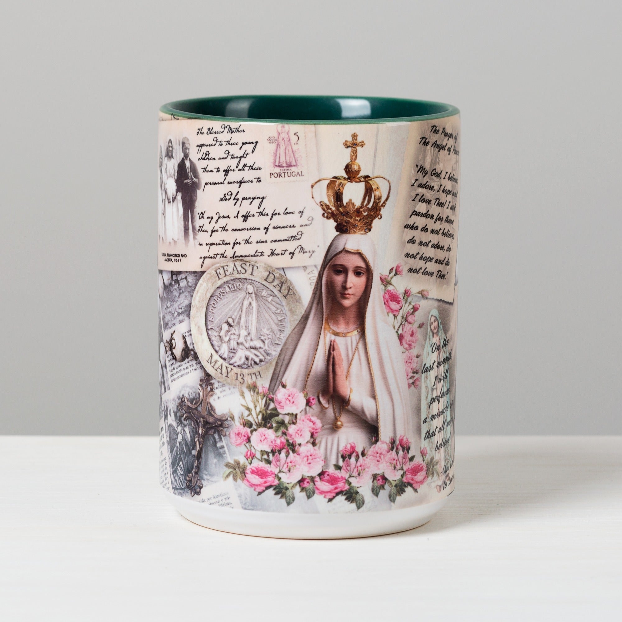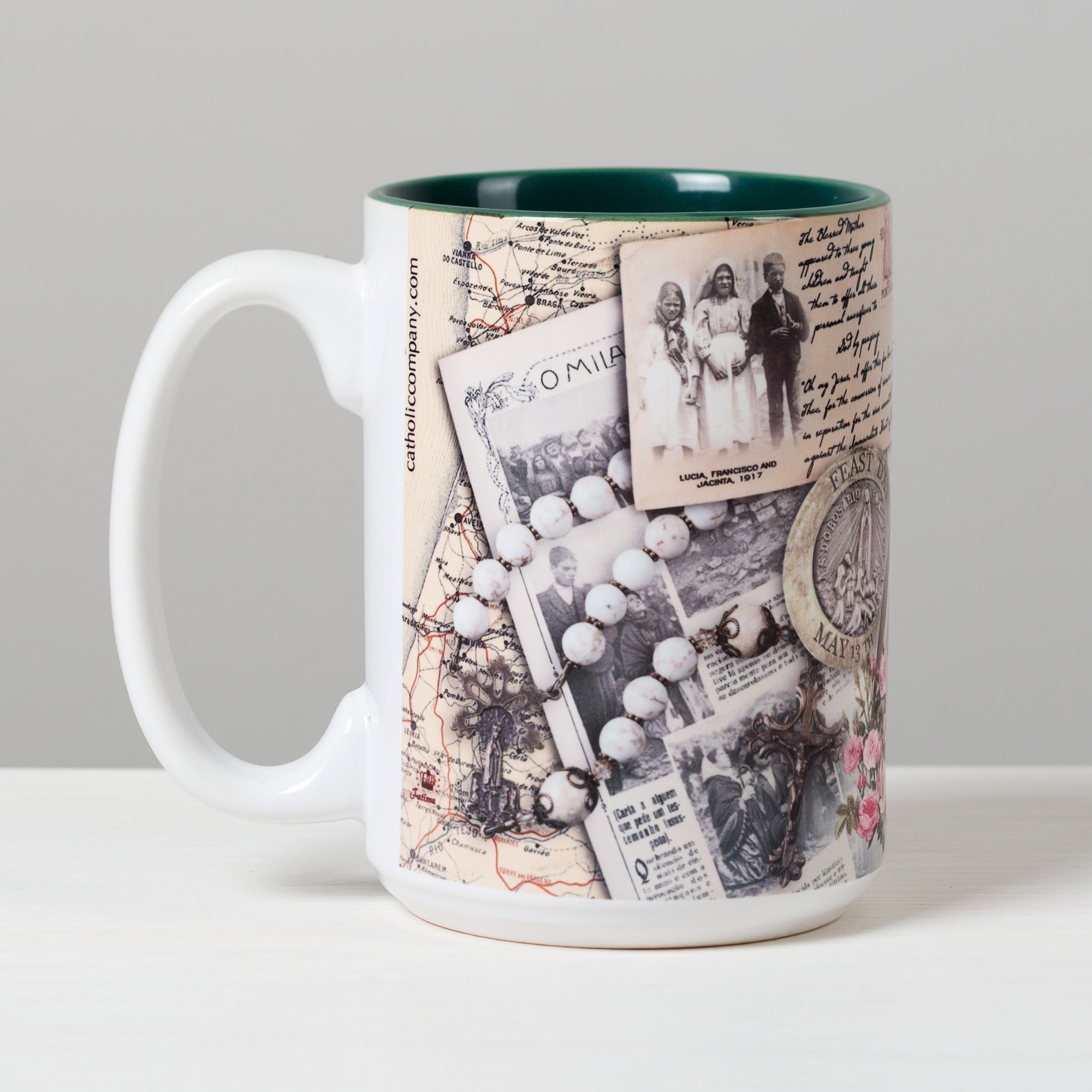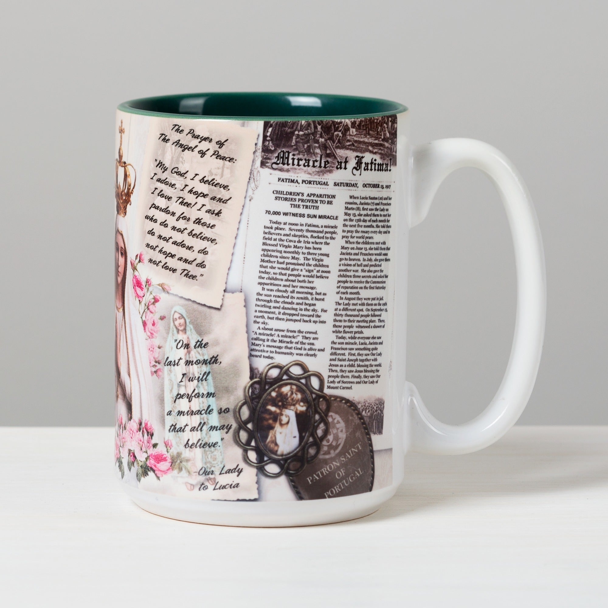 Start your day with peace and prayer using the Our Lady of Fatima Story Mug. This exclusive Catholic Company design features a unique collage of imagery, memoirs, and prayers in a scrapbook style. With a 15 oz capacity and a dark green interior, it's perfect for coffee or tea lovers devoted to Our Lady of Fatima. Microwave safe and best hand washed, this mug makes a meaningful gift.