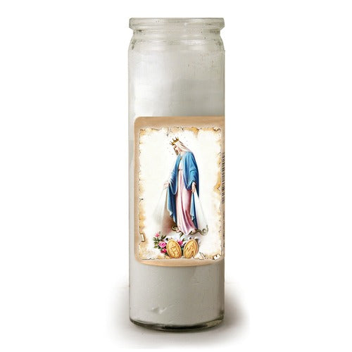 The Our Lady of Grace 3 Days Candle is a devotional offering crafted from slow-burning paraffin wax. It features a bilingual prayer to Our Lady of Grace, printed by Cromo NB in Milan, Italy. Measuring 8.25" in height and 2.25" in diameter, this candle provides spiritual illumination for up to three days.
