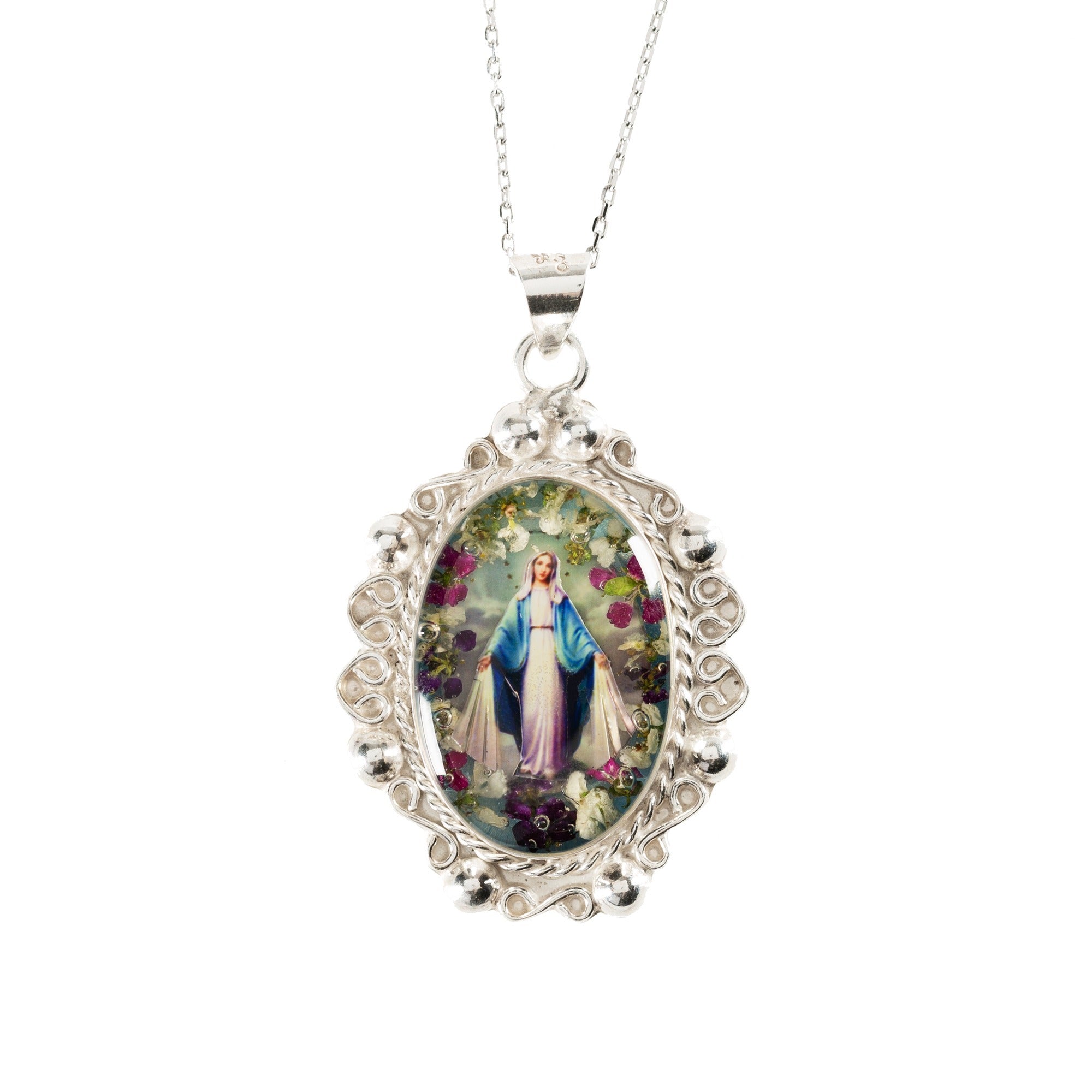 The Our Lady of Grace Baroque Pendant features an ornate silver-tone depiction of Mary, adorned with hand-applied pressed flowers. This stunning 16" sterling silver necklace combines artistry and devotion, showcasing flowers grown and dried in Mexico. Each handmade piece is unique, with flower colors varying by season, offering a distinctive and meaningful expression of faith and femininity.