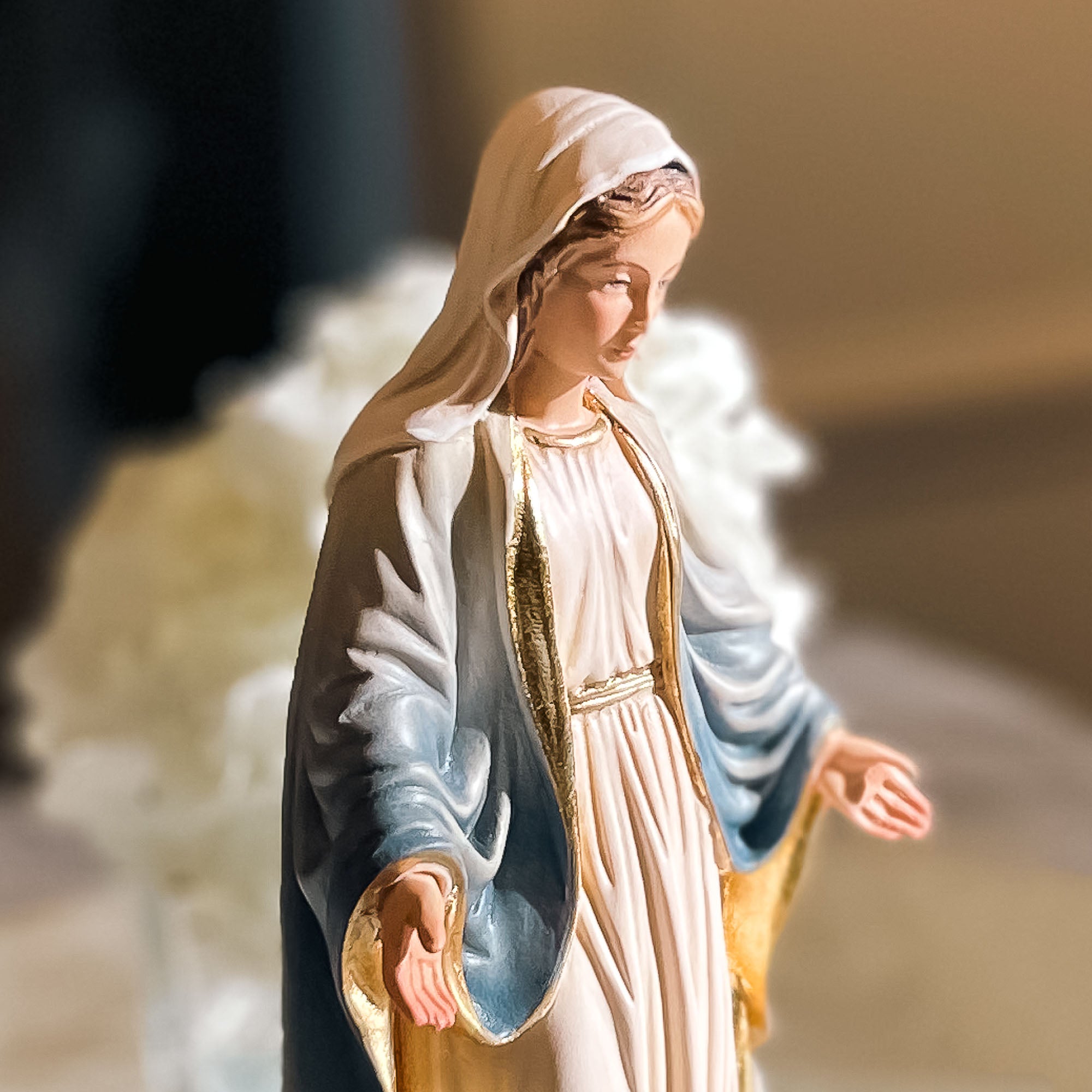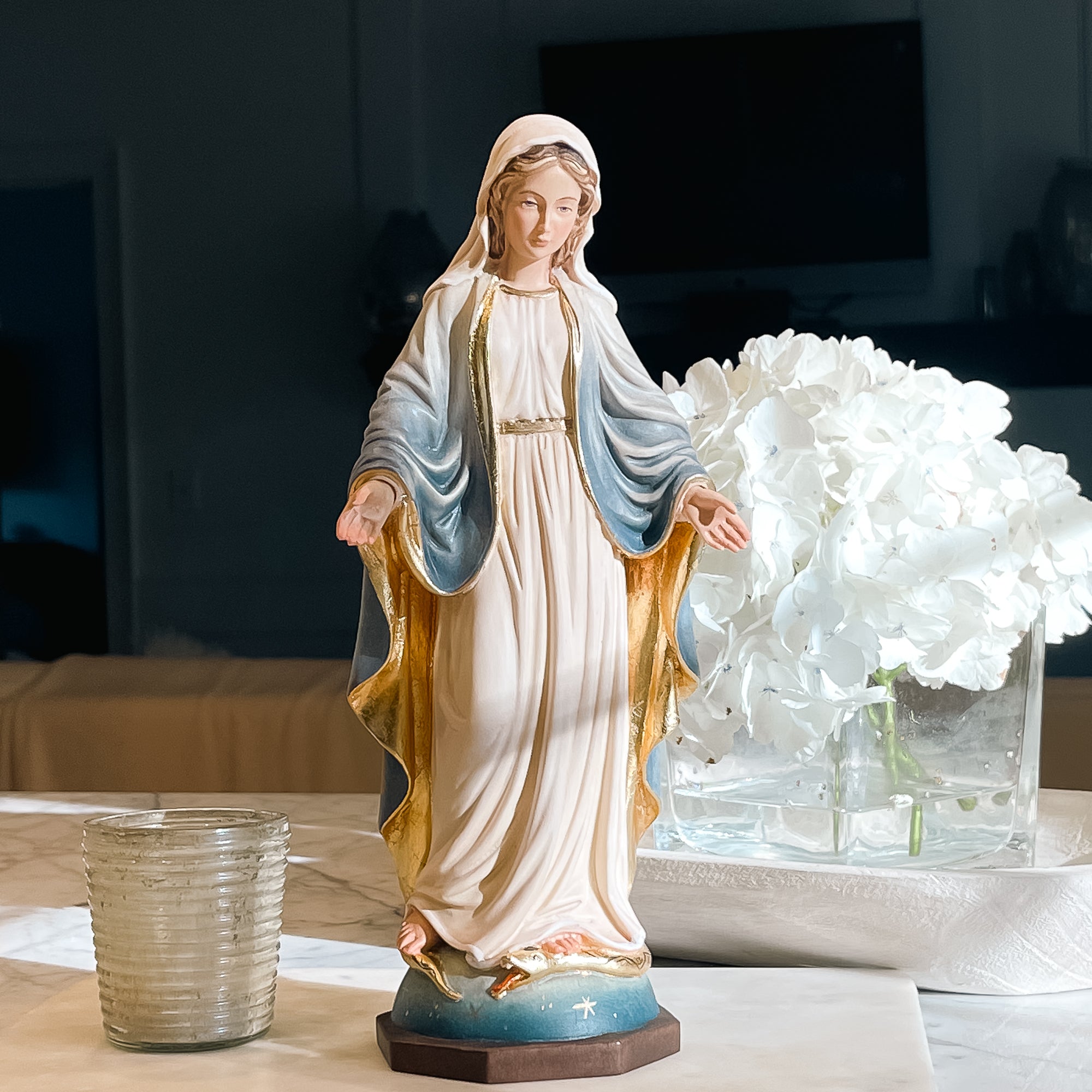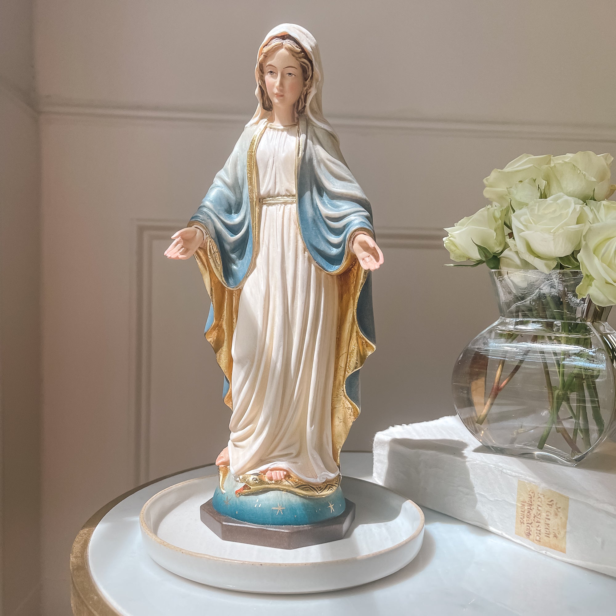 This exquisite 11" Our Lady of Grace hand-painted Italian statue is a masterpiece from the Tyrol woodcarving tradition. Crafted and painted by skilled Italian artisans, it features vibrant colors and fine details. Ideal for parishes, offices, chapels, or schools, this statue encourages devotion to the Blessed Mother and invites her intercession.