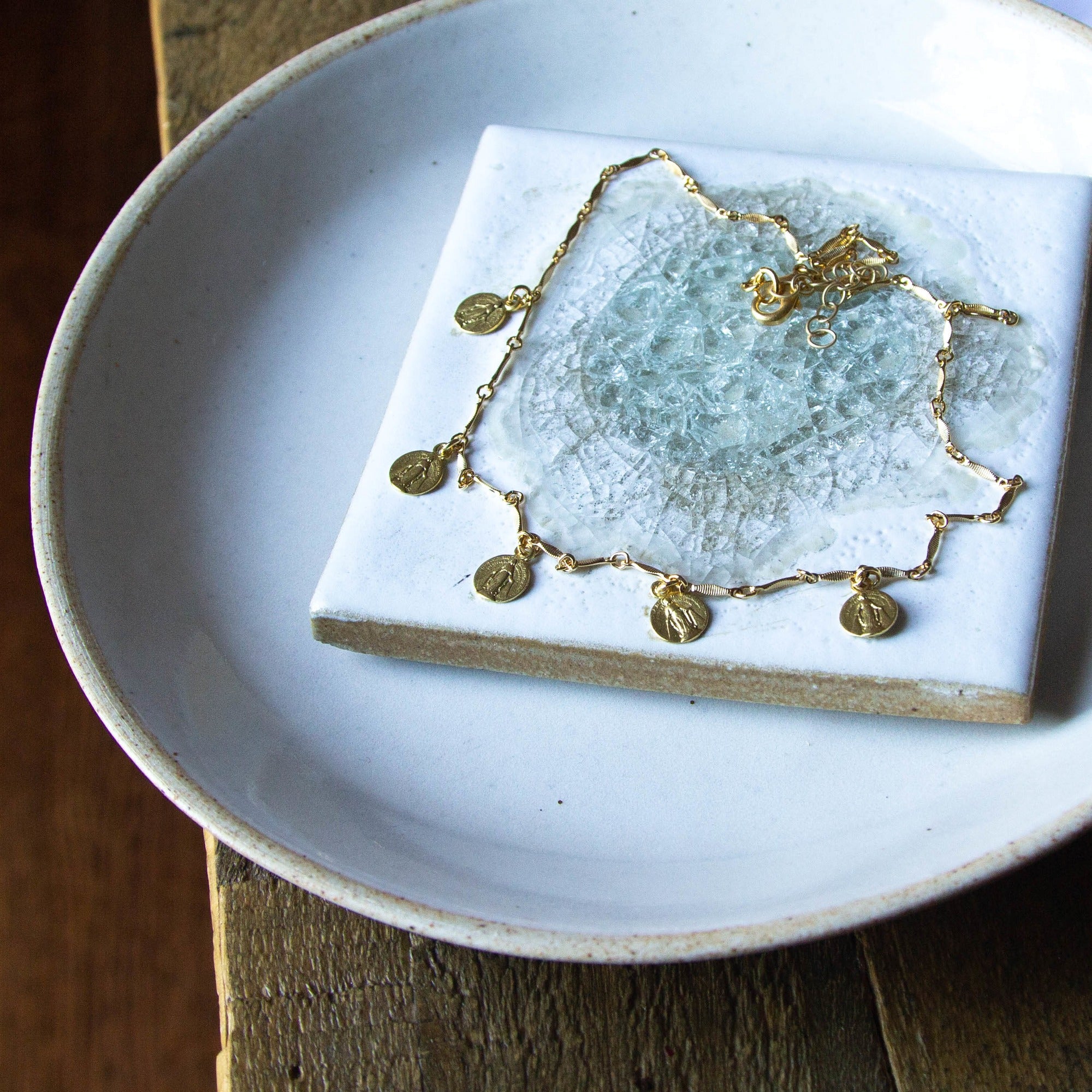 Elegant in its simplicity, this necklace is as unusual as it is striking. It features five small medallions of Our Lady of Grace, with her image on the front and a delicate flower vine embossed on the back. Medallions are strung on a truly unique and artistic chain. The medals are 14K gold plated. Wear a hand-crafted piece of art that honors Our Lady in heavenly style. This delicate and graceful necklace will become a special favorite.