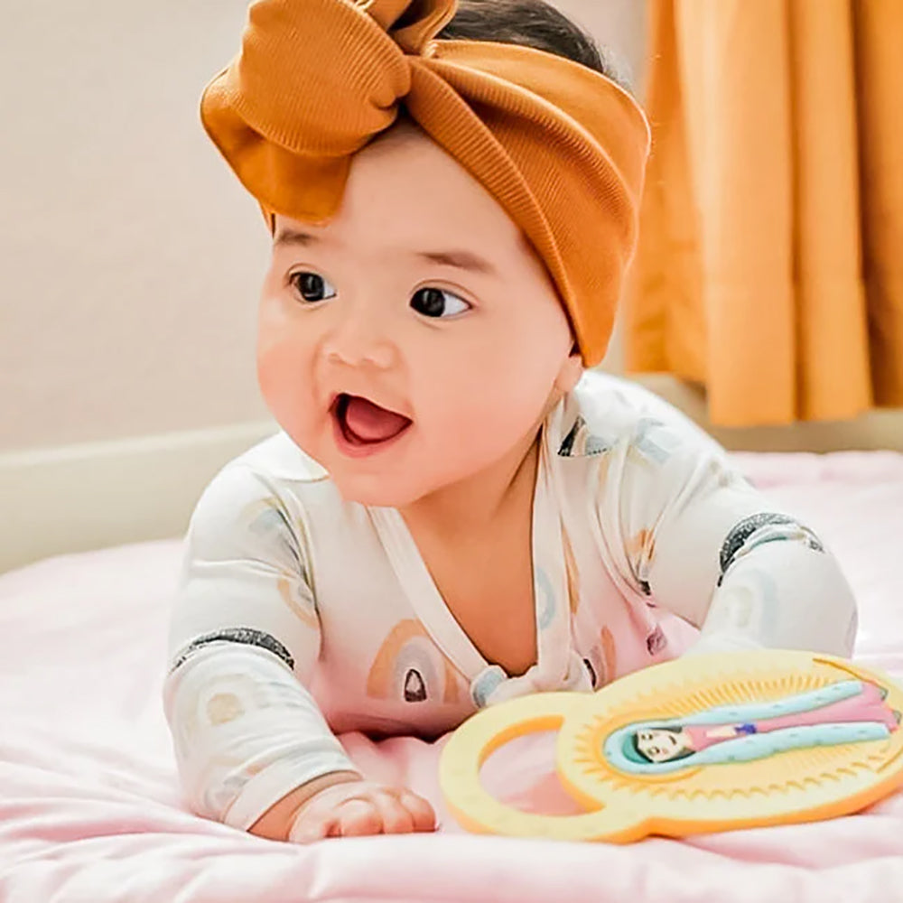 - Bright yellow silicone teething ring
